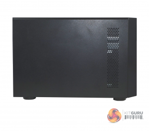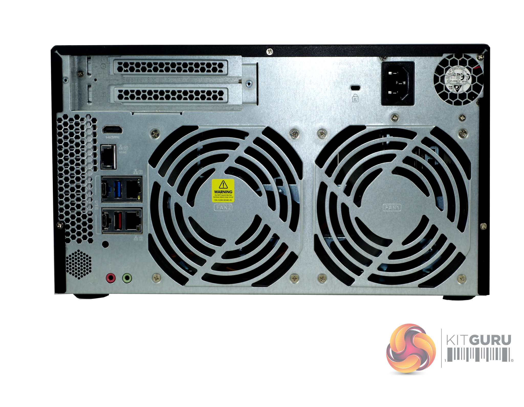 Dominating the rear panel of the TVS-872N are the pair of grills for the two 120mm system cooling fans. Above the fans to the left-hand side of the panel is the external access for the PCIe slots, also situated here is the reset button.