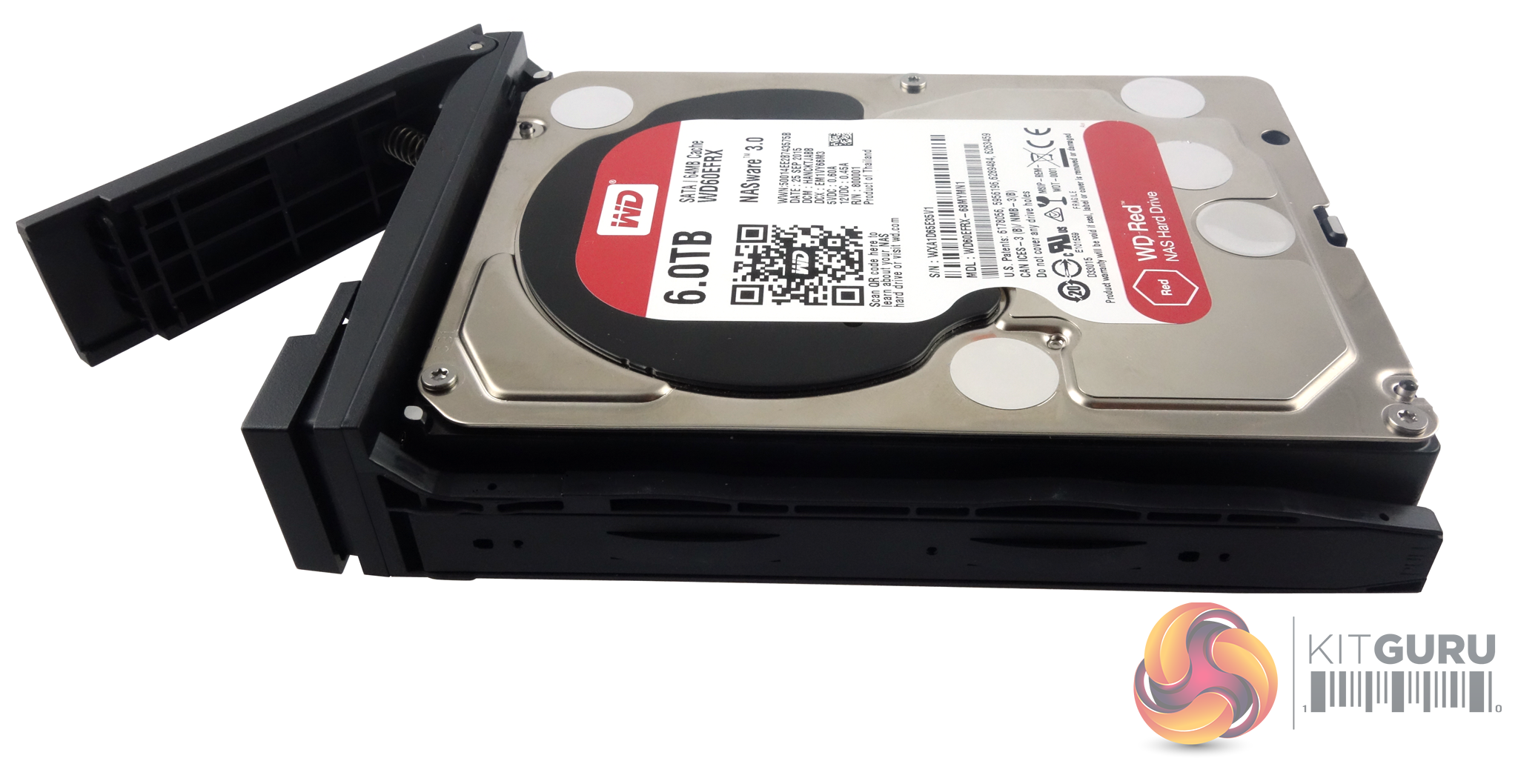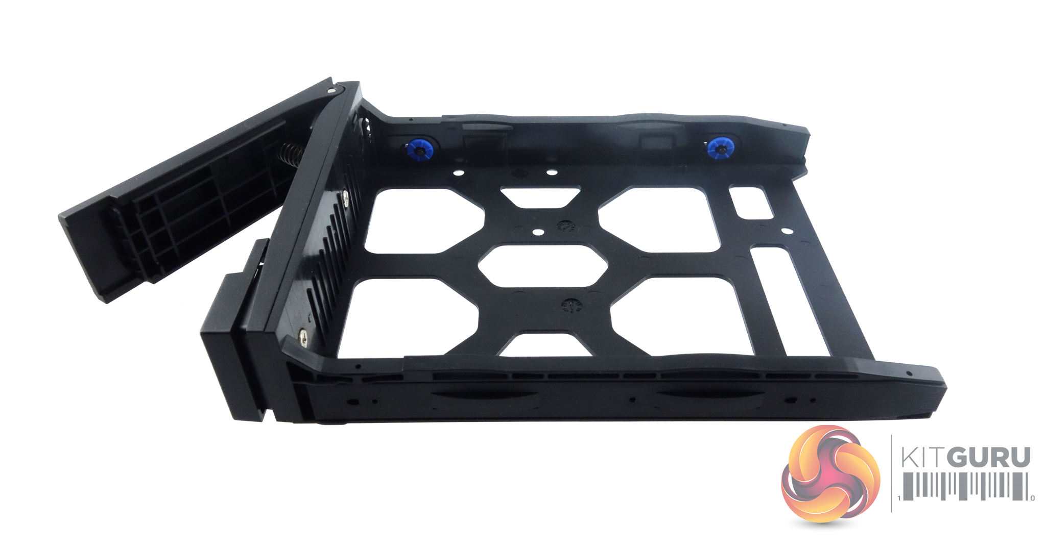 The 3.5in drive trays are tool-free. A plastic strip fits into the side rails with a pin at either end that goes through the corresponding holes in the rail sides. These pins then lock into the screw holes on the drive’s side – simple but effective. If you want to make sure the drives don’t move, then QNAP has supplied enough screws (3 per drive) to fix them in place. The holes in the tray sides have rubber vibration-reducing grommets fitted. The trays support 2.5in drives and the only way to fix them is to use the bundled screws (24) to go through the bottom of the tray into the drive.