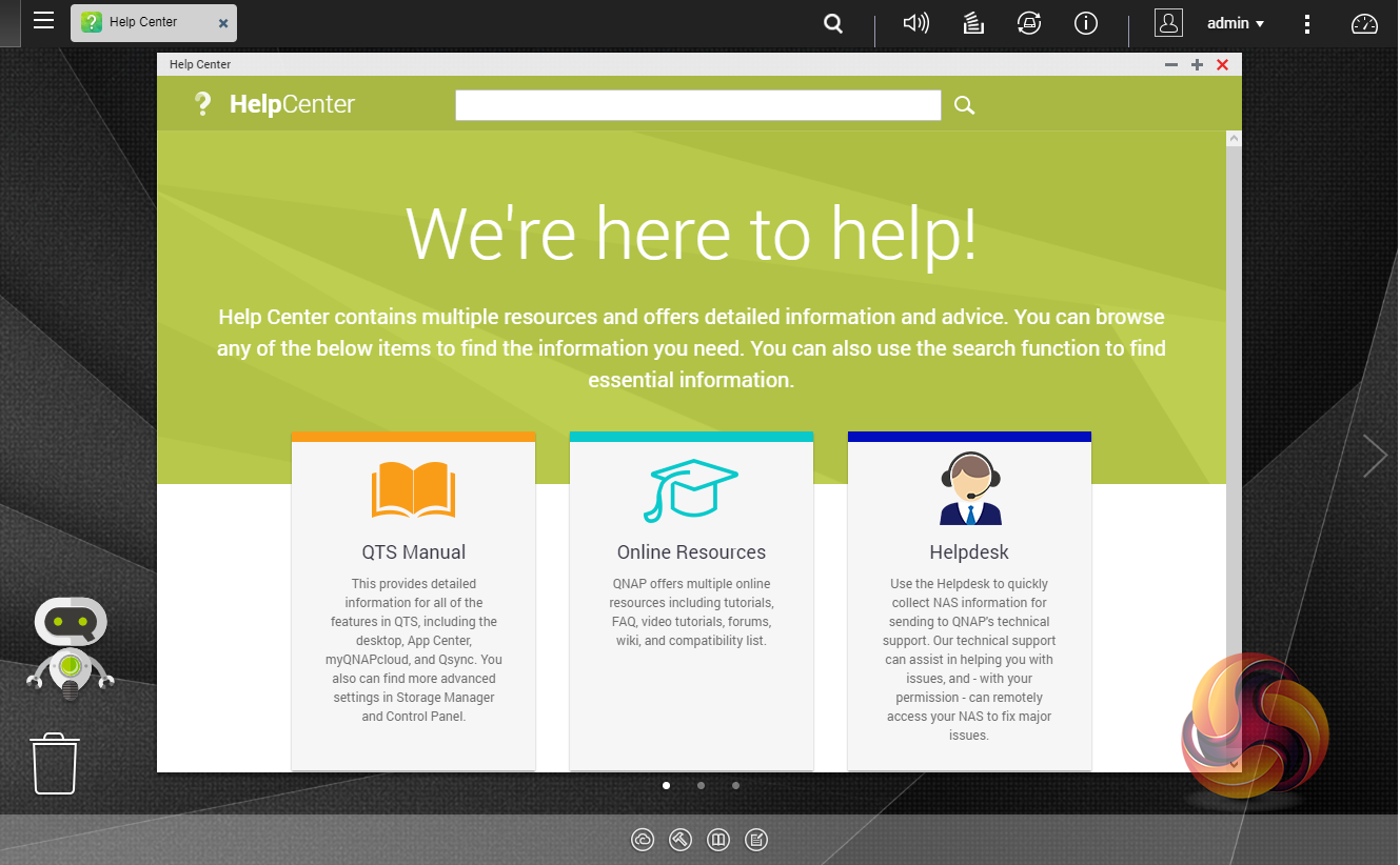 When you access the NAS for the first time you are met by the HelpCenter app. This comprehensive help utility provides access to the QTS manual, Online Resources including tutorials, video tutorials, FAQs and forums – or if all else fails you can connect to the QNAP Helpdesk for technical support.