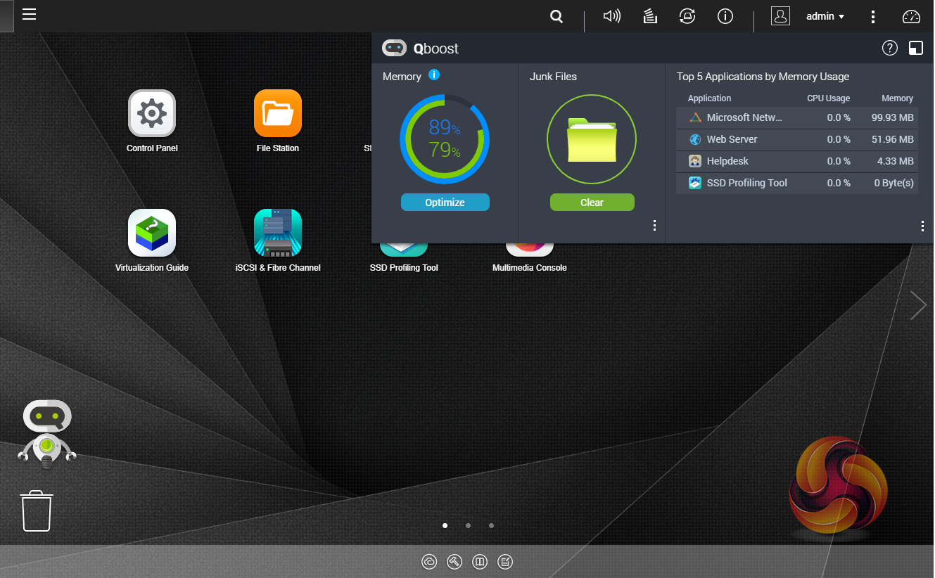 Qboost is an optimisation app that helps maintain the NAS at peak performance. It can free up system memory, reclaim storage space by clearing unnecessary system files and the recycle bin and help balance system load by managing schedules for most applications and services.