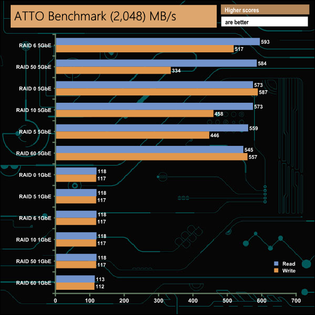 The fastest MB/s figure we got out of the TVS-872N was 593MB/s for reads, with the drives configured in a RAID 6 array and using a 5GbE connection. QNAP quote a Sequential read figure of 590MB/s using the 5GbE connection so that test figure can confirm that. The official Sequential write figure using 5GbE is 589MB/s, again we could confirm that with testing as the fastest write speed we saw was 587MB/s with the disks in a RAID 0 array. Using a 1GbE connection the unit was a model of consistency across all the tested RAID levels.