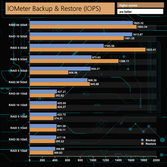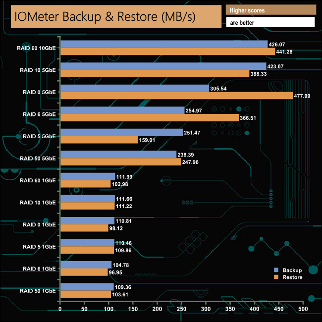 Our backup and restore tests proved no obstacle for any of the RAID arrays regardless of connection speed.