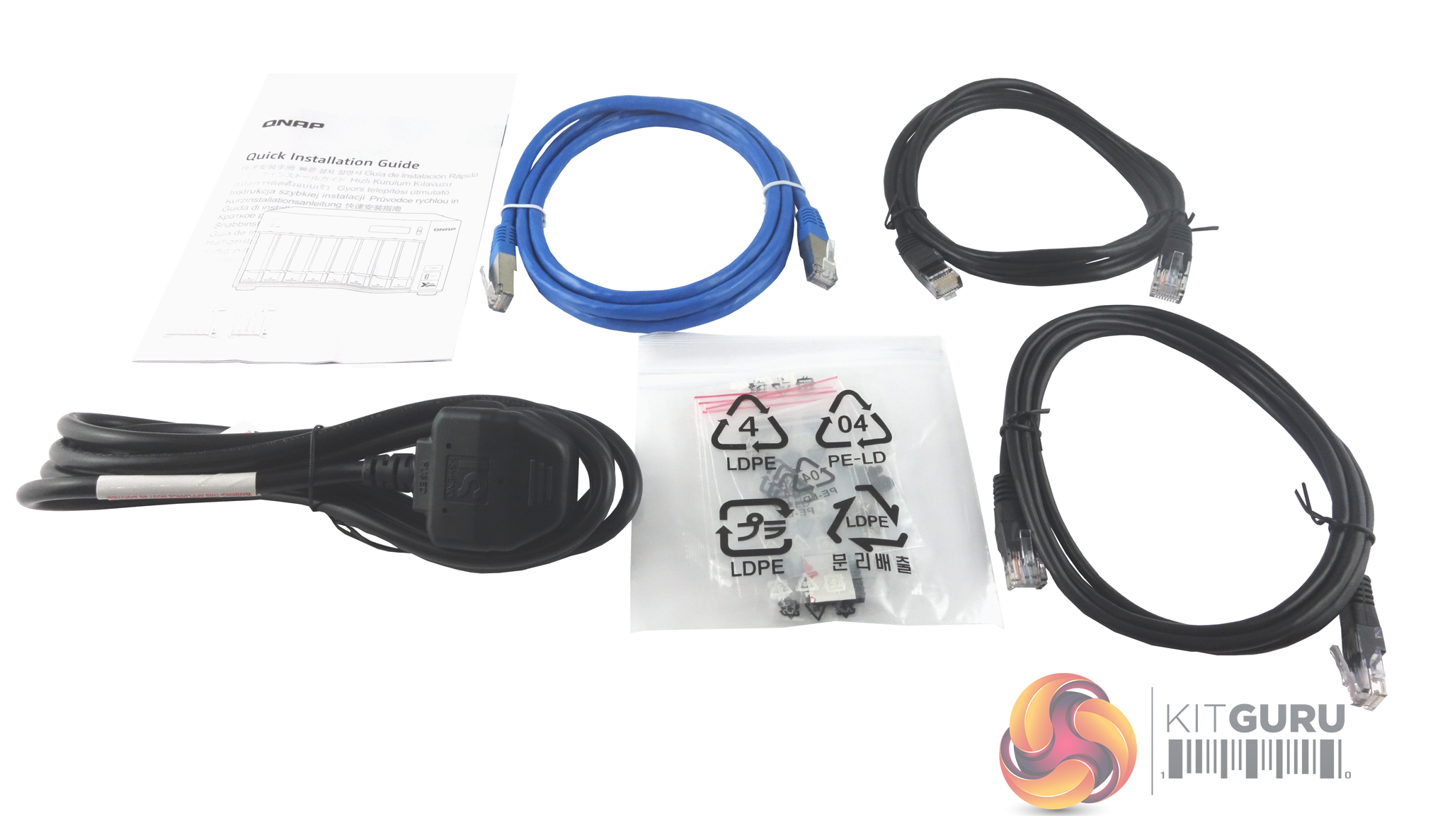 The box bundle for the TVS-872XT is pretty comprehensive. You get a pair of Gigabit Ethernet cables and a 10GbE cable, and enough fixing screws to secure 3.5in drives into the drive trays should you feel that the tool free system doesn’t hold the drives firmly enough. There's also a bag of screws for fixing 2.5in drives into the bays if you want to go down that route.