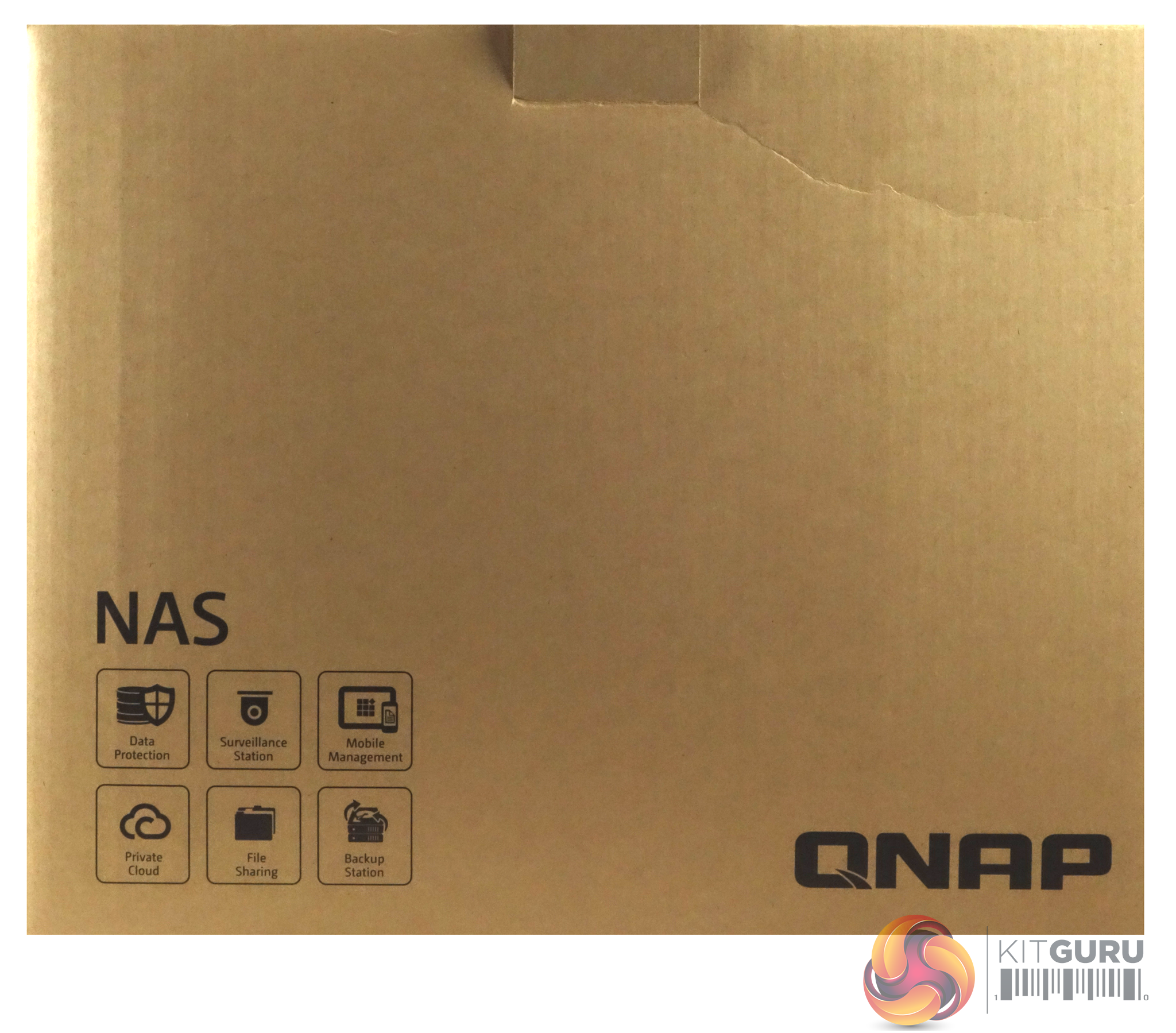 The rear of the box has a group of icons in the bottom left hand corner representing some of the QTS OS features; Data Protection, Surveillance Station, Mobile Management, Private Cloud, File Sharing and Backup Station.