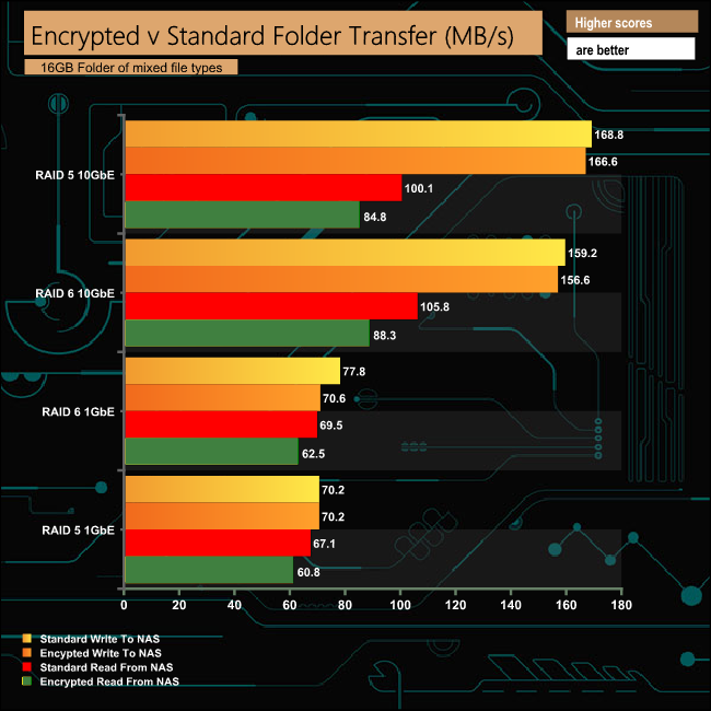 The XN5004T deals with encrypted data very well. The write performance is very good at both connection speeds, just dropping 2.2MB/s in RAID 5 and 2.6MB/s in RAID 6 with a 10GbE connection and 7.6MB/s (RAID 6) at 1GbE. It doesn't drop any bandwidth in RAID 5 at the slower connection speed.