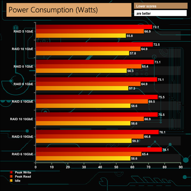 Our review sample came with a 10GbE card installed so we did our power tests with the card left in the NAS. The CPU in the NAS has a TPW of 51Watts, so that, together with a dual port 10GbE card isn't going to make the unit particularly frugal when it comes to it power draw.