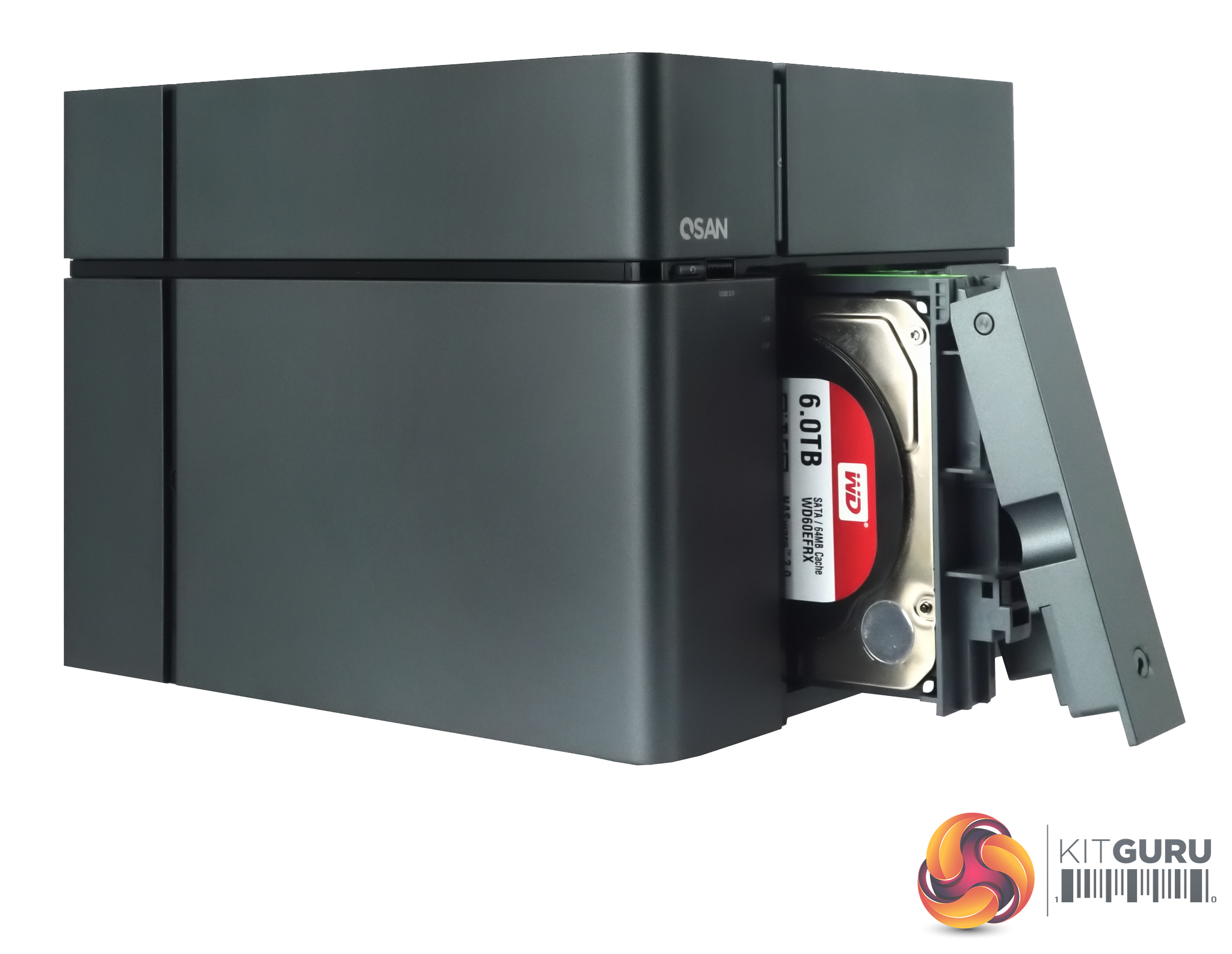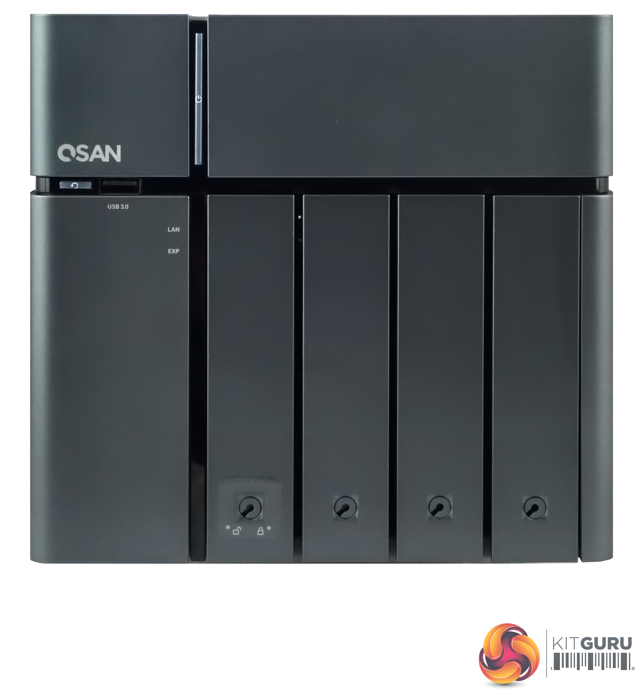 QSAN's XN50004T is a stylish looking and award winning NAS (the XCubeNAS won ‘Red Dot Award: Product Design 2019') and it certainly stands out from the usual grey/black business NAS boxes. The dark grey enclosure appears to have been divided into separate panels with gaps between the panels finished in a high gloss piano black, a simple enough idea, but it works very well. In the vertical gap between the front two top “sections” sits the long slimline power button. This button has an LED indicator built into it to show power and system status. Below the power button and next to the drive bays are the LED indicators for LAN and expansion unit status.