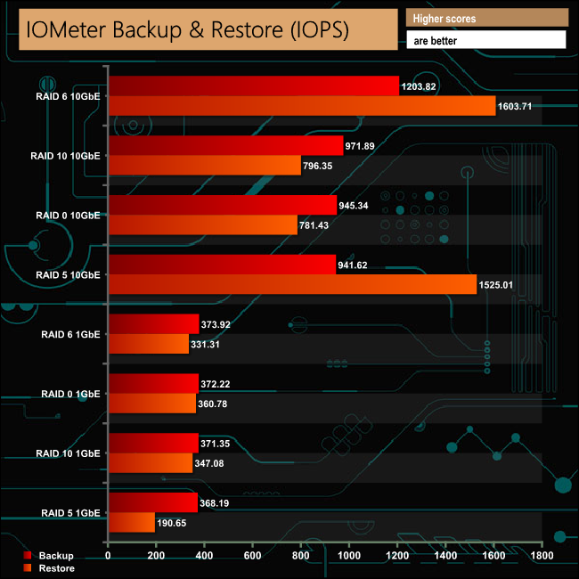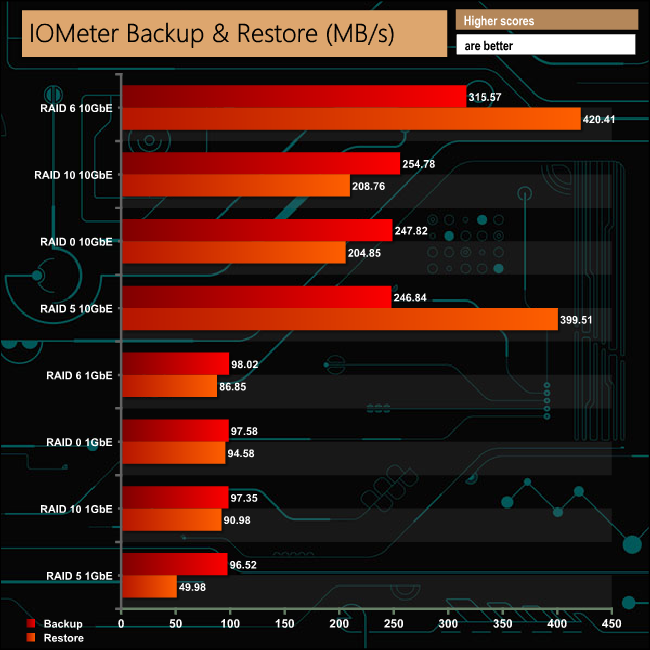 The XN5004T dealt with our backup/restore tests without out any problems, although the restore figure of 49.98MB/s in RAID 5 with a 1GbE is disappointingly low.