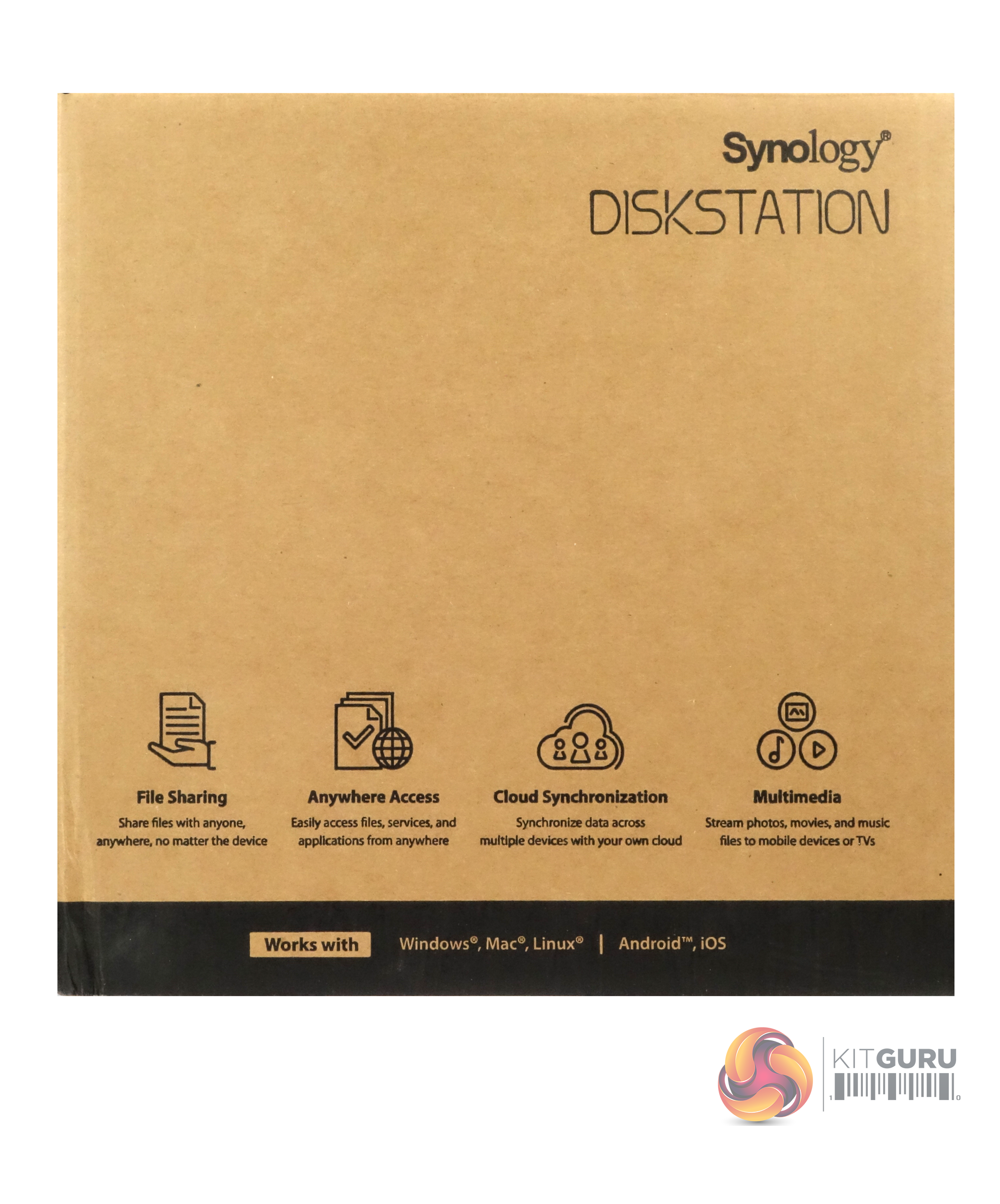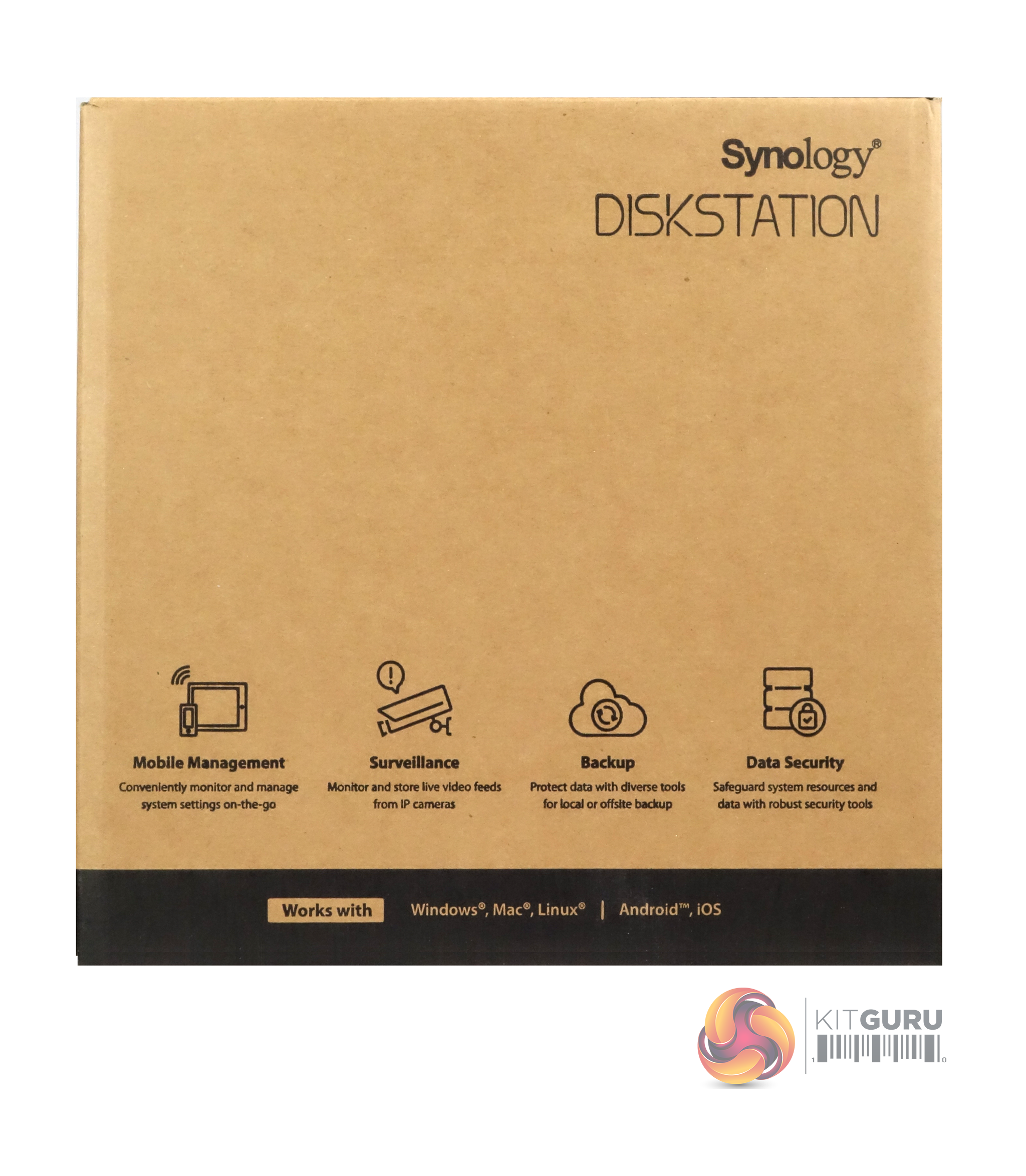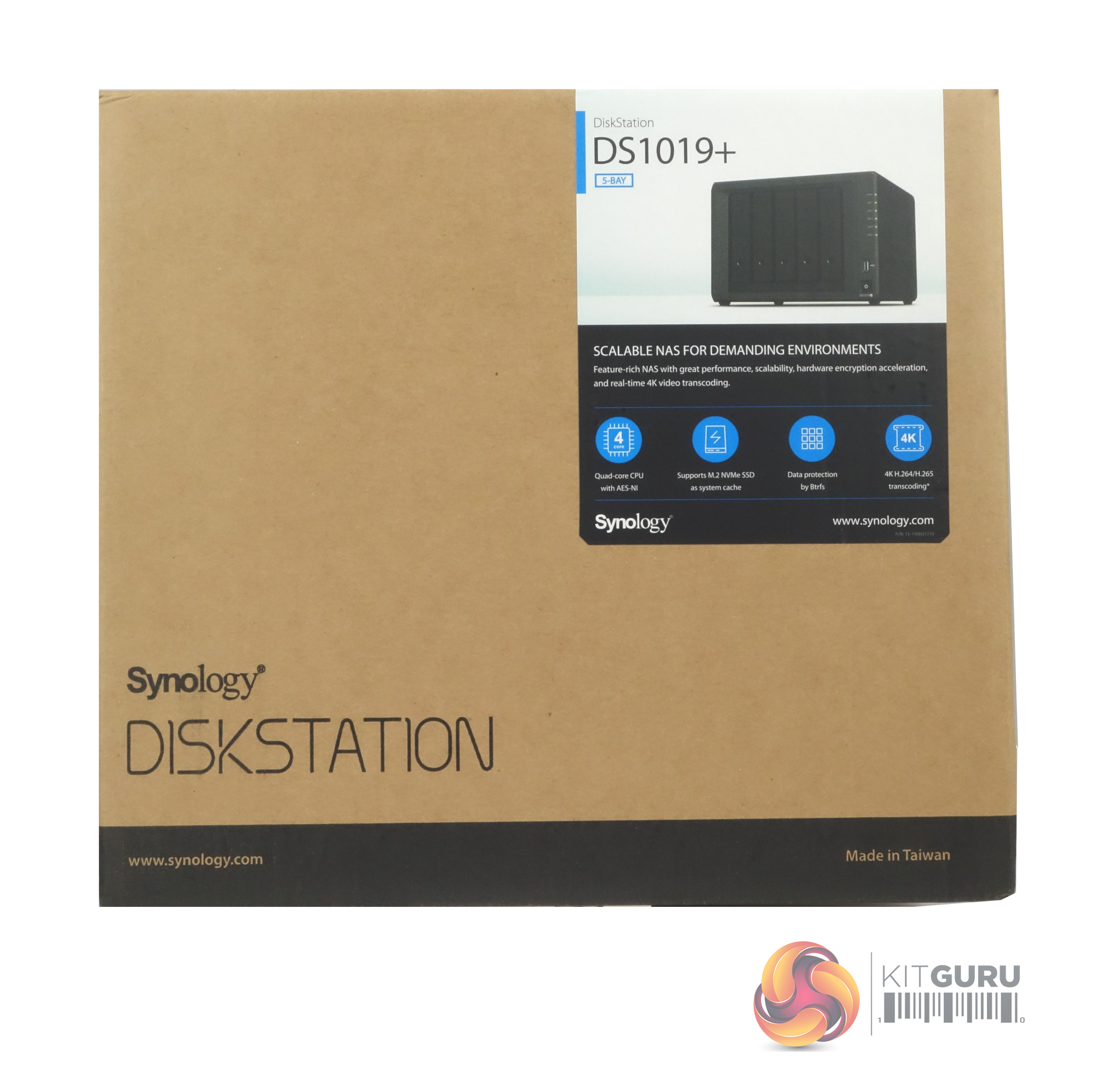 The Synology DiskStation DS1019+ arrives in a smallish brown box with a label on the top right-hand corner. The label contains an image of the unit, as well as some key features of the DS1019+; Quad core CPU with AES-NI, the fact it supports two M.2 NVMe SSDs, uses the Btrfs file system and that it supports 4K H.264/H.265 transcoding.