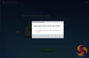 Once the NAS is found, the first window of the DSM setup wizard appears. Pressing install (there’s also a manual install option to install a downloaded instance of DSM) automatically downloads the latest version of DSM and starts installing it after reminding you that any data on the hard disks will be deleted.