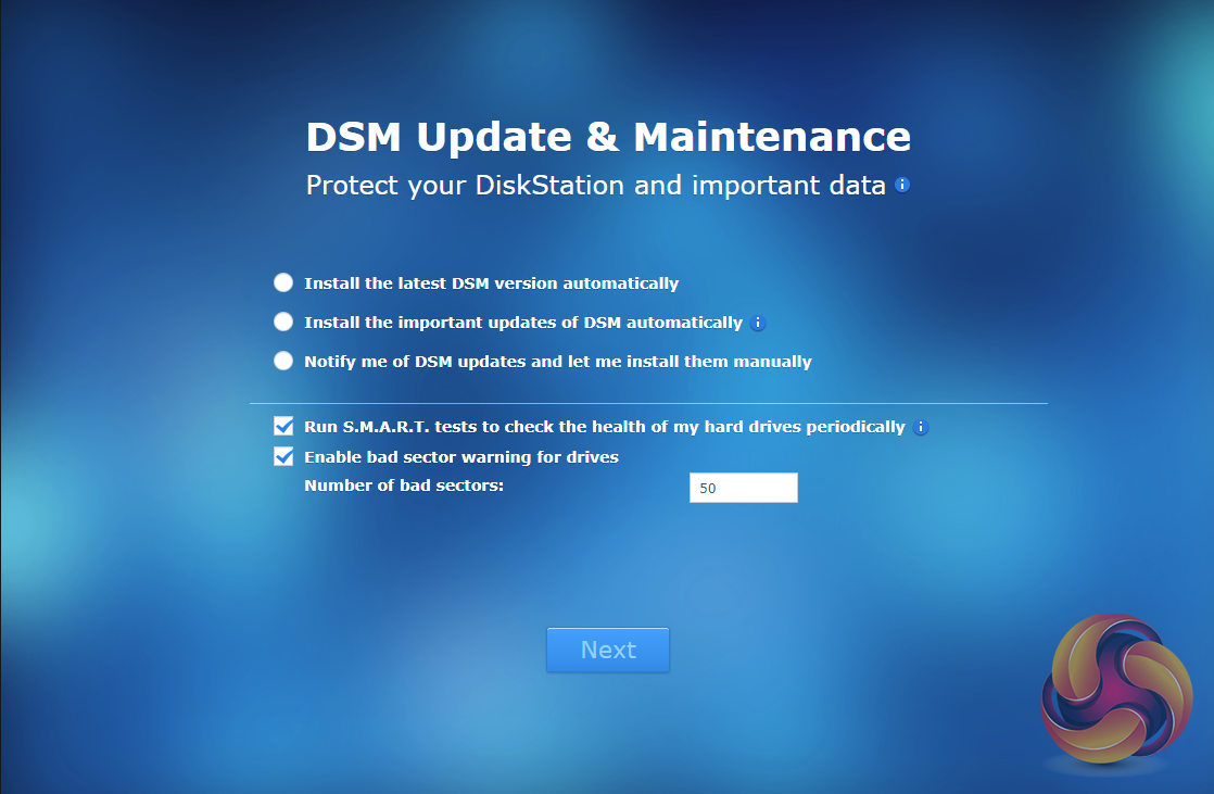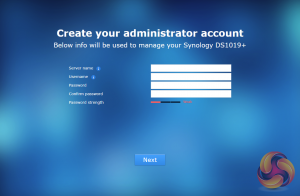 After the basic install has finished, the NAS is restarted and next up comes the setting up of the NAS account management, where you assign a server name, admin user name and password. The next window is where the DSM update settings are set.