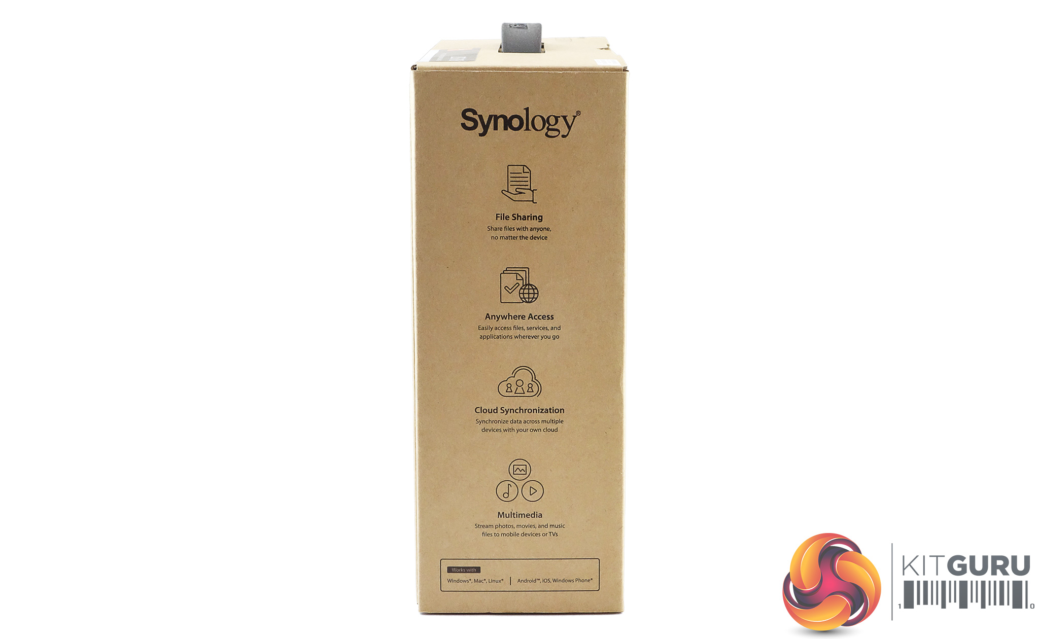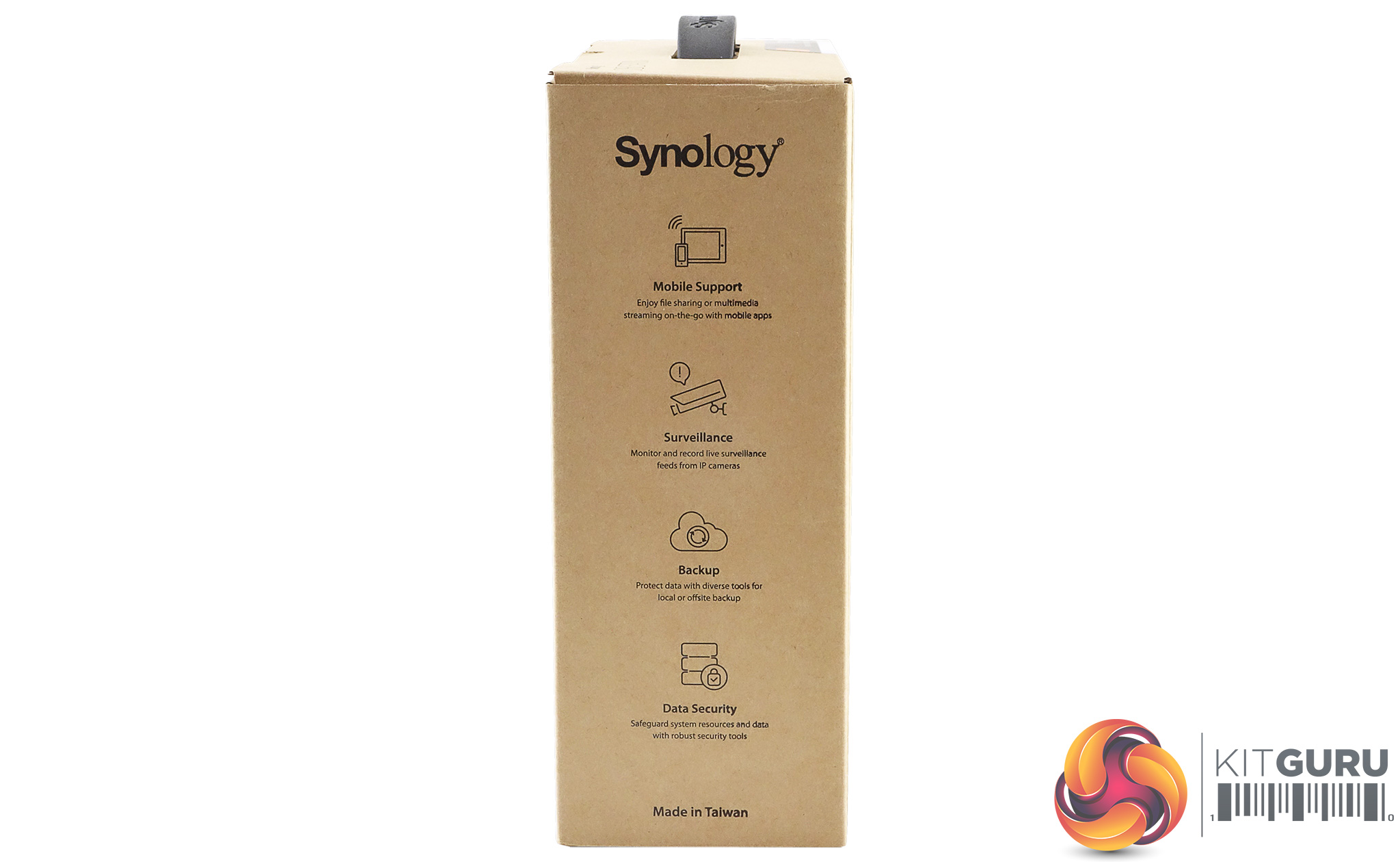 The DiskStation DS118 comes in a fairly compact box with a sticker in the top right hand side displaying a good clean image of the unit. Under the image are a row of icons describing some of its features; quad-cored CPU, 4K 10-bit H.265 transcoding, adjustable LED indicator brightness and the fact it uses Synology's DiskStation Manager.