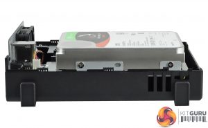 The two halves of the enclosure slide apart (there's a handy sticker under the case which shows which way to slide to unlock it) revealing the drive mounts. At the time of writing this review, the DS118 supports drives up to and including 12TB of capacity.