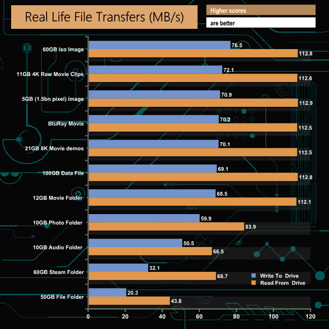 To test real-life file/folder performance we use a number of different file/folder combinations to test the read and write performance of the NAS device. Using the FastCopy utility to get an MB/s and time taken for each transfer, the data is written from and read back to a 240GB SSD.