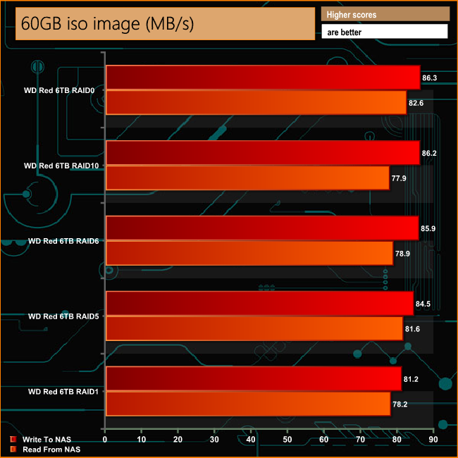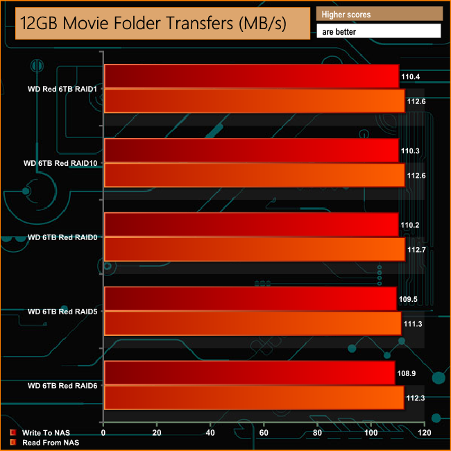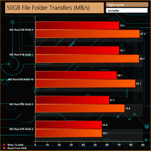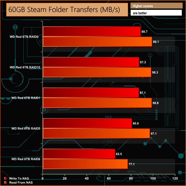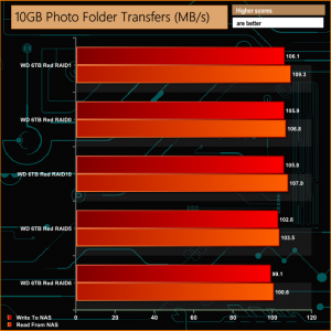 The Synology DS1517+ performed well in all our real life transfer tests. During the 60GB Steam folder test it got very close to the 100MB/s mark for reads and over 80MB/s for writes for all arrays except RAID 6 where the performance dropped off for both reads and writes. It was the same story in the 50GB File folder transfer with pretty good performance across the arrays apart from RAID 6.