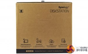 Both sides of the box feature a row of feature icons along the bottom. One side these display icons for Mobile Management, Surveillance, Backup, Data Security while the other side features File Sharing, Anywhere Access, Cloud Synchronization and Multimedia.