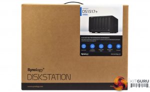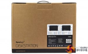The front of the box has a label in the top left corner with an image of the drive on it along with the unit version and which memory model it is. Under this image is a row of five icons describing the CPU, the number of LAN ports, options for the PCIe slot and the fact that the DS1517+ supports the Btrfs file system.