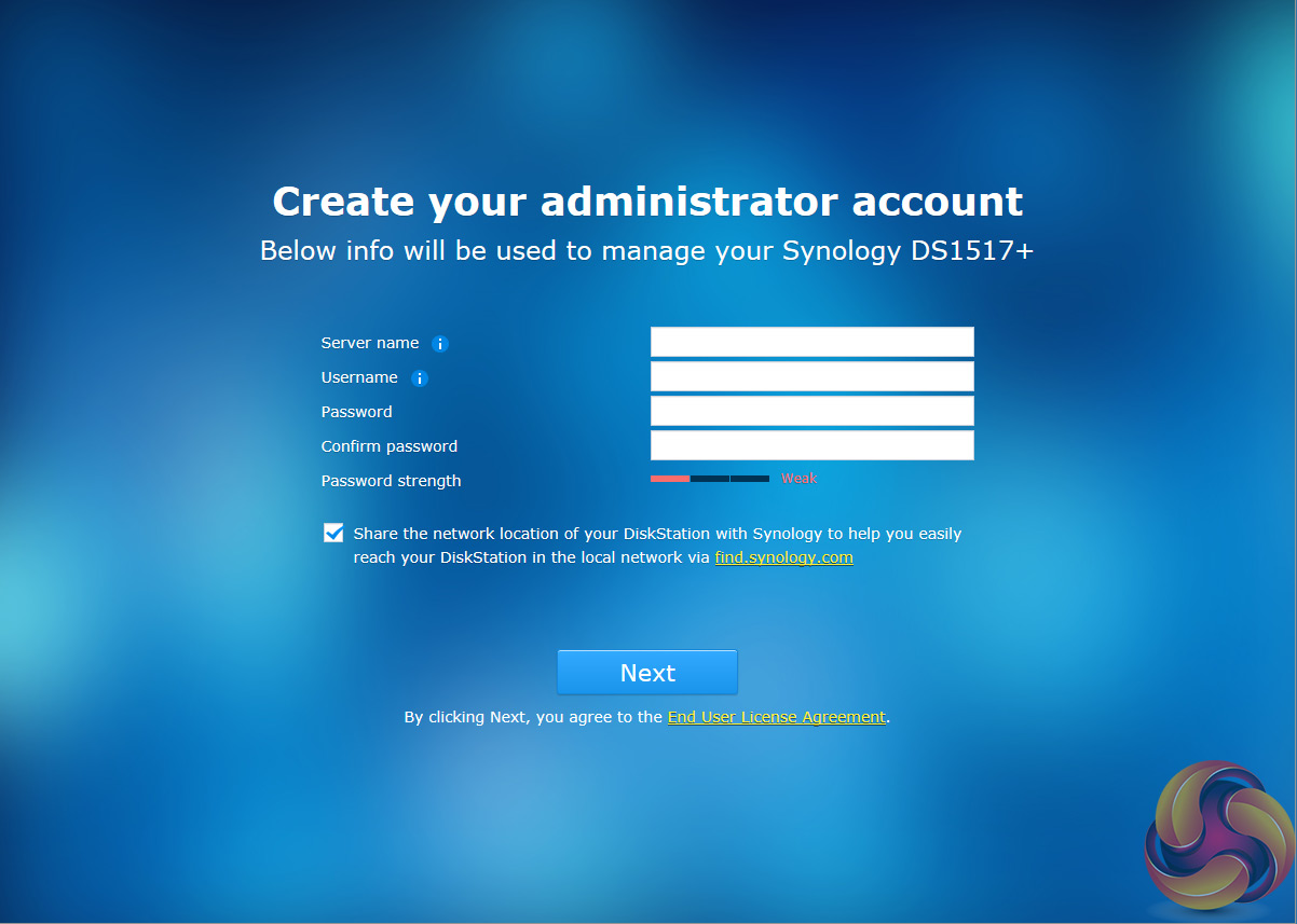 After the basic install has finished, the NAS is restarted and next up comes the setting up of the NAS management, where you assign a server name, admin user name and password. The next window is where the DSM update settings are set.