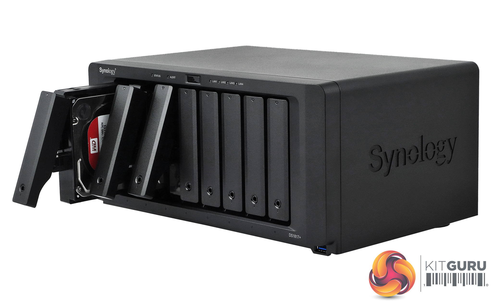 Thanks to its vertical mounted drive bays, the DiskStation DS1817+ is pretty compact for an 8-bay NAS measuring 243 x 343 x 166mm. The well built unit is finished in black with a metal cover and a decent quality plastic front bezel.