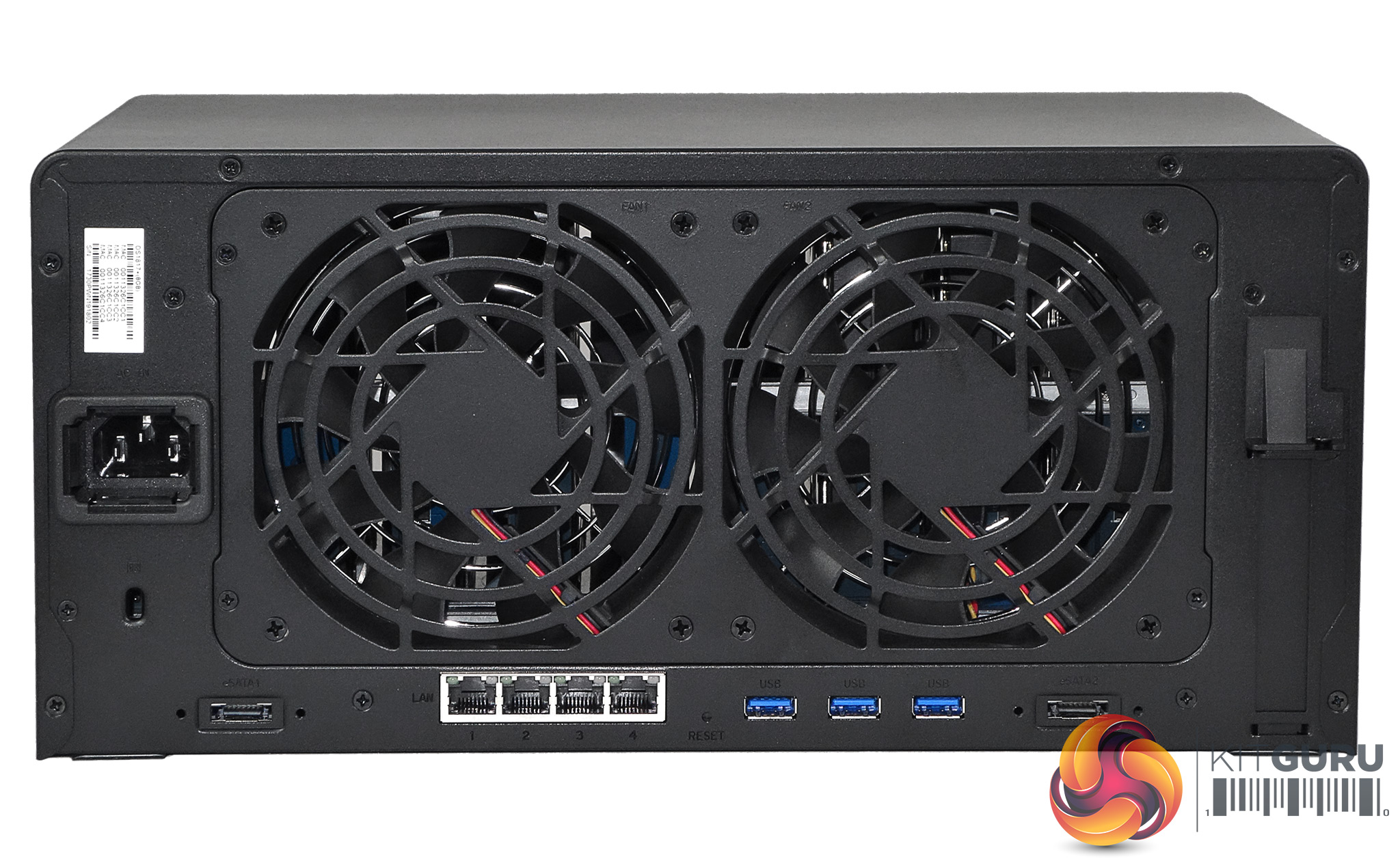 To the right of the fans is the blanking plate for the PCIe slot while under them sit the four LAN ports and three USB 3.0 ports together with the reset button. To either side of these ports is an eSATA port.