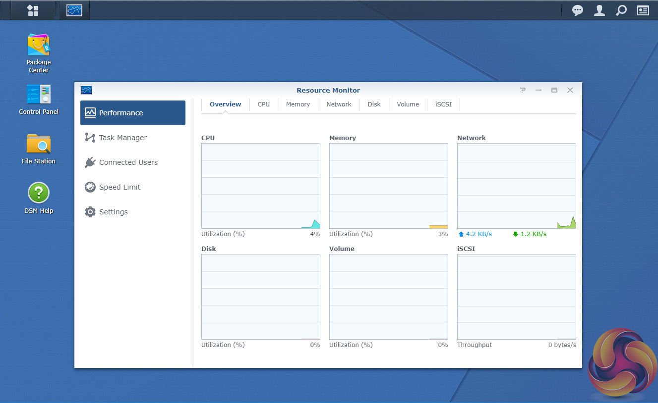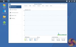DSM has a graphically rich interface with all the major features of the OS clearly listed. The basic start page just lists four items; Package Center, Control Panel, File Station and DSM help. Clicking on the left-hand top tab opens a small window with more advanced menu choices than the basic one. Clicking on the furthest right-hand icon at the top of the window opens the System Health and Resource Monitor widgets.