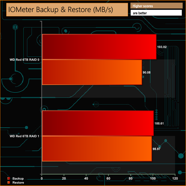 We set IOmeter up (as shown above) to test both backup and restore performance on a 100GB partition.