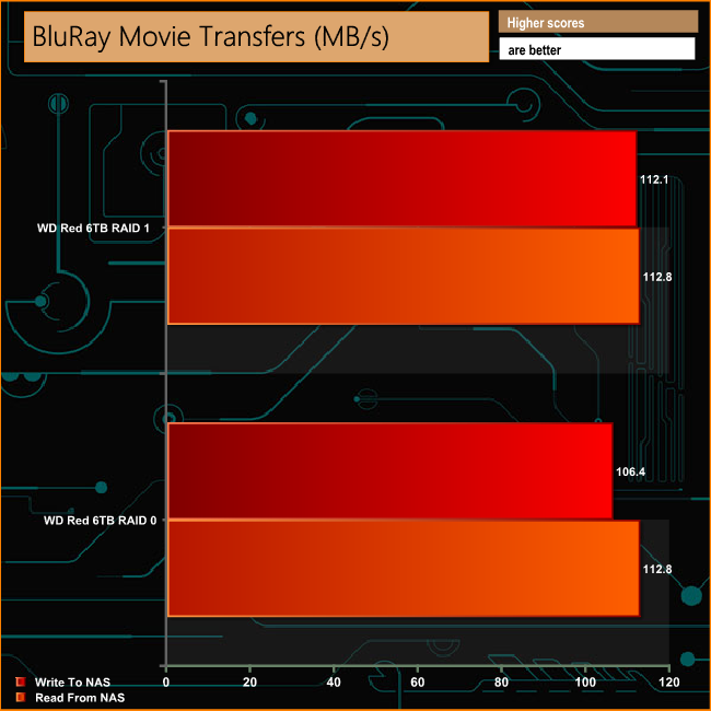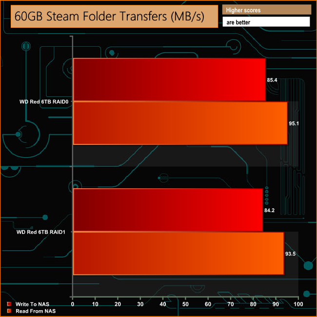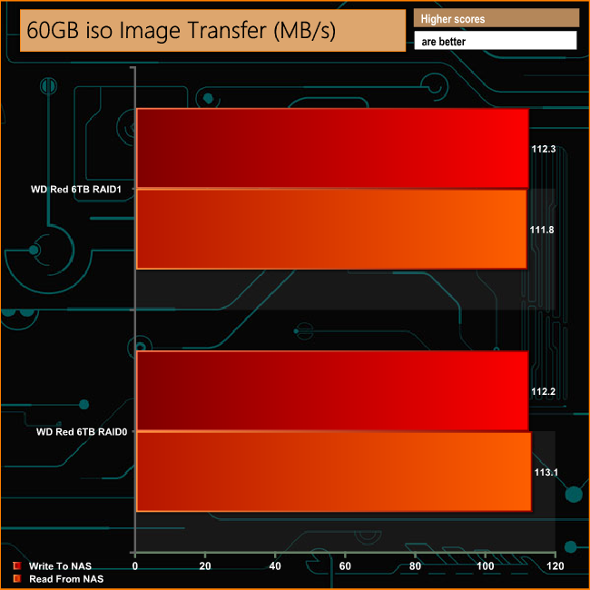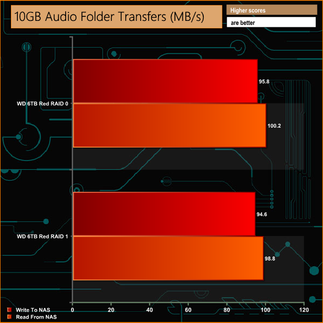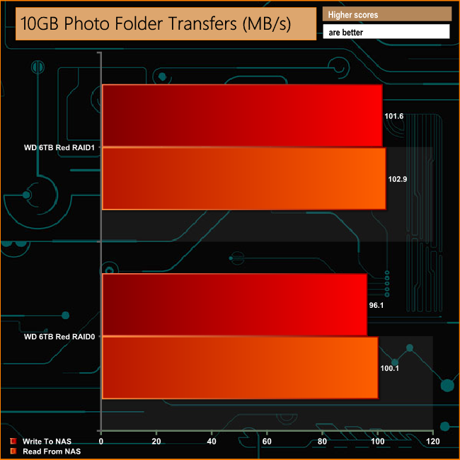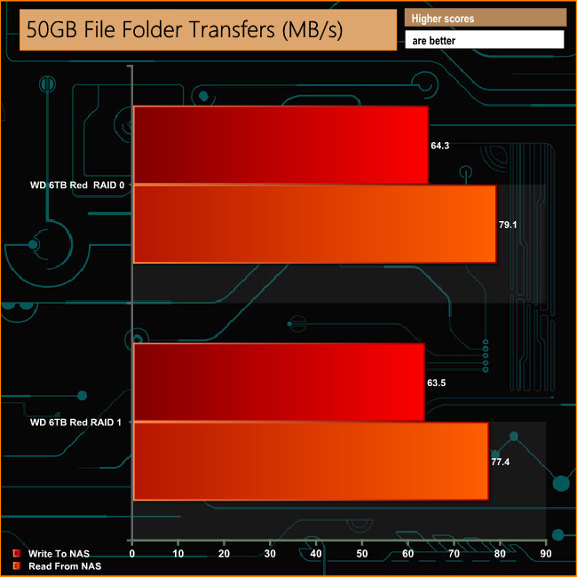 When it came to dealing with our real-life file transfer tests, the DS218j performed very well. For the vast majority of the tests the performance topped or was very close to 100MB/s. The only tests where the performance dipped was when the NAS had to deal with the contents of the 50GB File Folder with writes dropping to an average of 63.9MB/s and reads to 78.25MB/s.