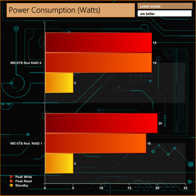 We tested the peak power consumption of a NAS at the wall during a run of CrystalDiskMark 5.0.2 as this version of the benchmark runs the read and write benchmark suites separately so its easier to monitor what power the device is using during each function.