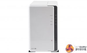 The DS218j has an all-white enclosure apart from one half of the front bezel which is dark grey and home to all the indicator lights and a silver grey panel on the rear of the unit that holds the ports. The vertically stacked front indicators are for; system status, network activity and a pair for hard drive activity.