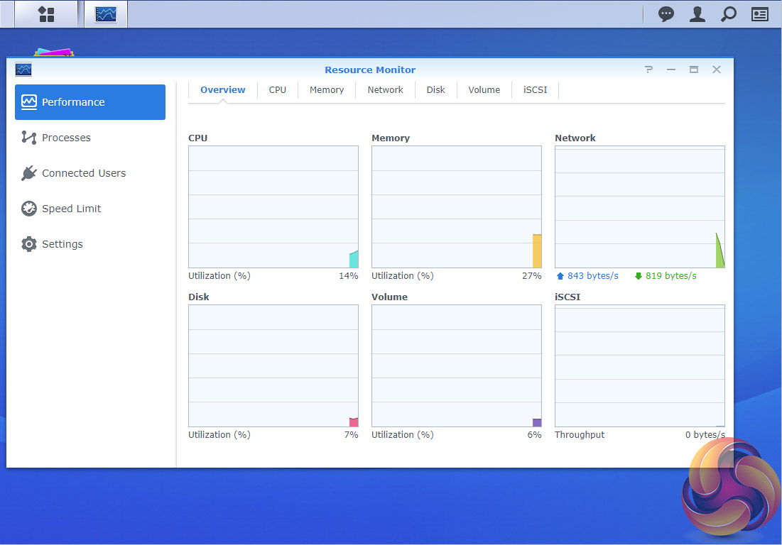 The Resource Monitor is an easy to use tool to keep an eye on the DiskStation’s resources. With it you can monitor CPU usage, memory usage, disk utilization and network flow in real time or historically.