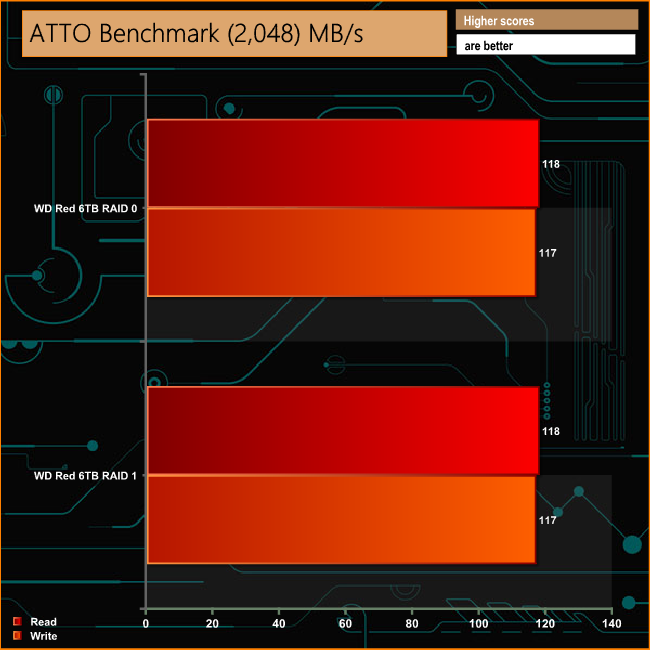 Synology quote Sequential Read/Write performance figures for the DS218j at 113MB/s and 112MB/s respectively, something we were able to confirm and even better a little with the ATTO benchmark. The tested drive produced a read score of 118MB/s for both RAID 0 and RAID 1arrays with writes at 117MB/s for both arrays.