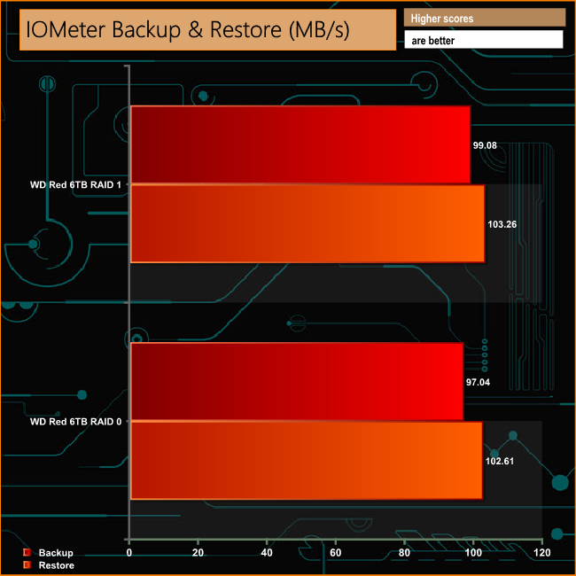 The NAS performed well in the Backup/Restore test averaging 98.06MB/s for the Backup test and 102.93MB/s for the restore runs.