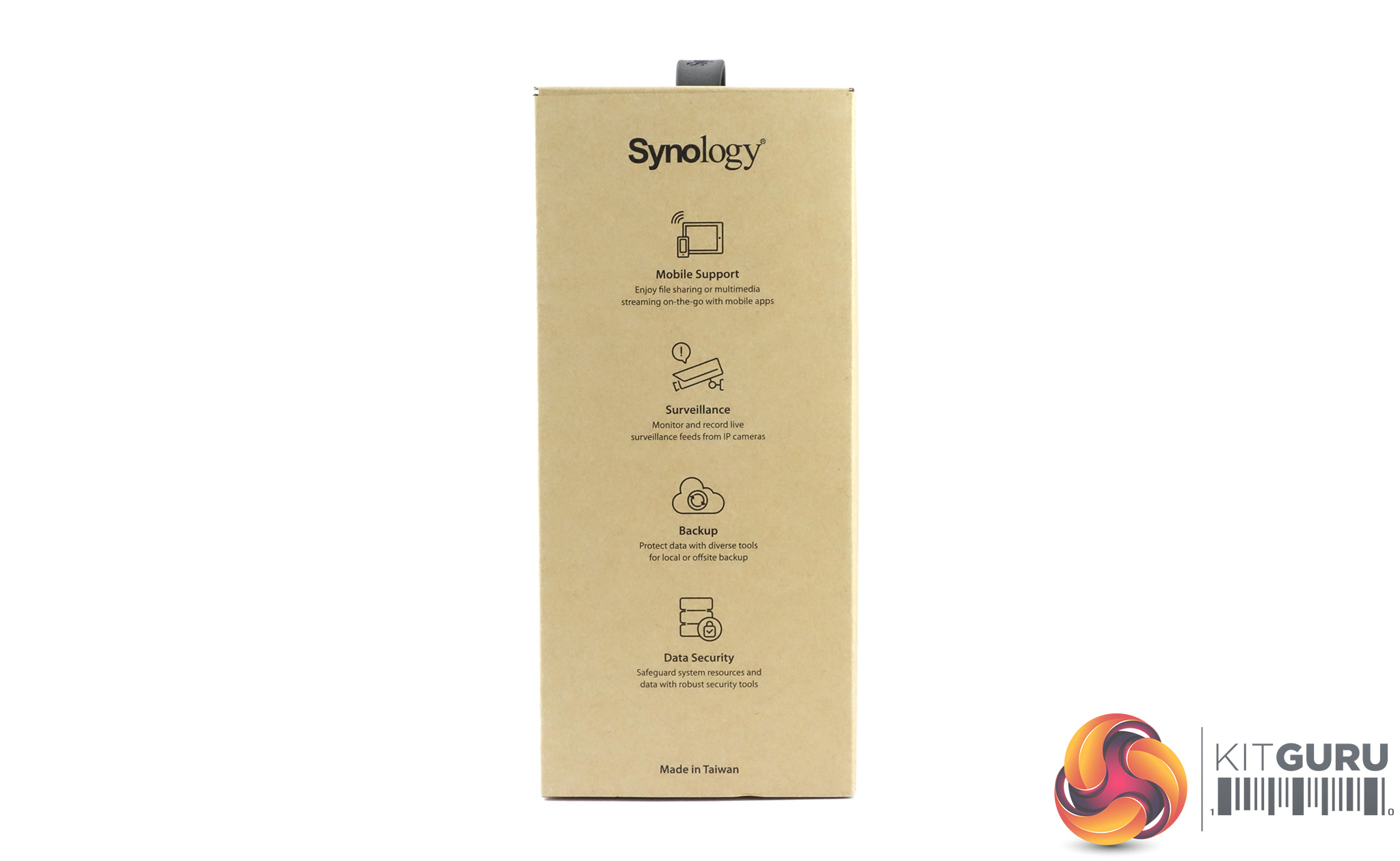 Both sides of the box feature a list of feature icons. One side displays icons for Mobile Support, Surveillance, Backup and Data Security while the other side has File Sharing, Anywhere Access, Cloud Synchronization and Multimedia uses listed.