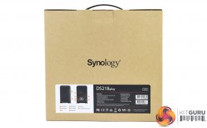 The Synology DiskStation DS218play ships in a compact brown box with a sticker in the top right hand side displaying an image of the unit. Under the image are a row of icons describing some of its features; 64-bit quad-cored CPU, 4K 10-bit H.265 transcoding, adjustable LED indicator brightness and over 20TB raw capacity.