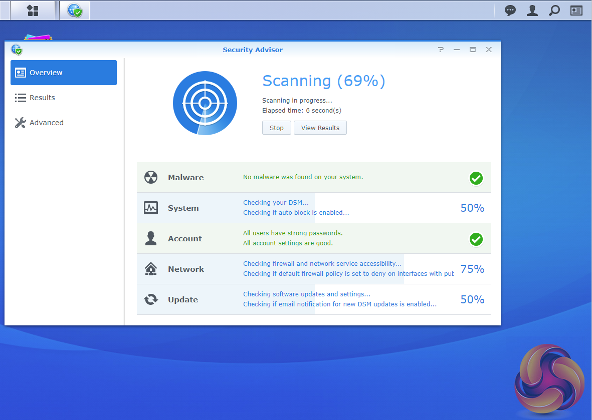 Security Advisor is a useful tool that conducts regular scans the DSM settings and the NAS for any security risks. It provides detailed results so if any actions need to be taken its quick and easy to find out where and what's needed to correct any errors.