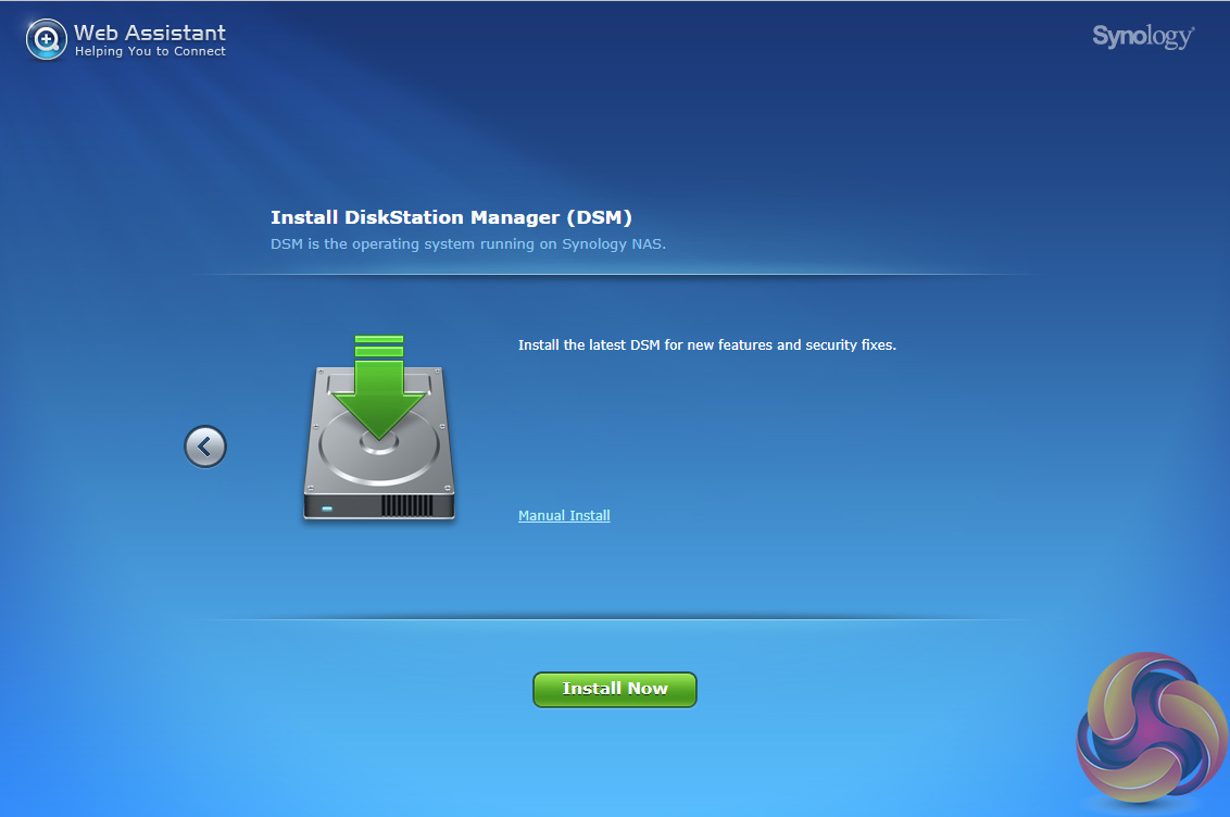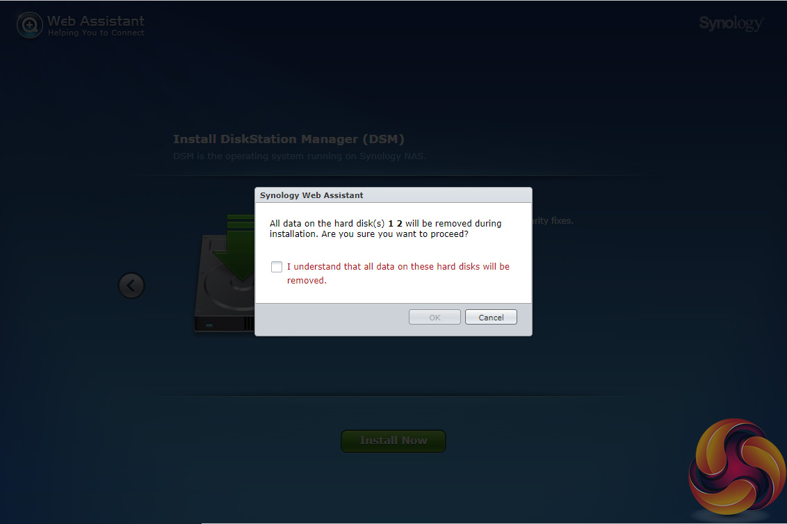 Pressing install (there’s also a manual install option to install a downloaded instance of DSM) automatically downloads the latest version of DSM and starts installing it after reminding you that any data on the hard disks will be deleted.