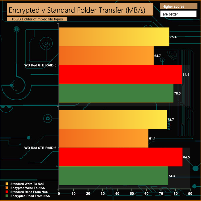 The hardware encryption engine in the Realtek RTD1293 CPU works well as there is only around a 10 – 12MB/s drop in performance when transferring an encrypted folder to and from the DS418j when in RAID 5 and 6 arrays.