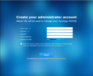 After the basic install has finished, the NAS is restarted and next up comes the setting up of the NAS management, where you assign a server name, admin user name and password. The next window is where the DSM update settings are set.