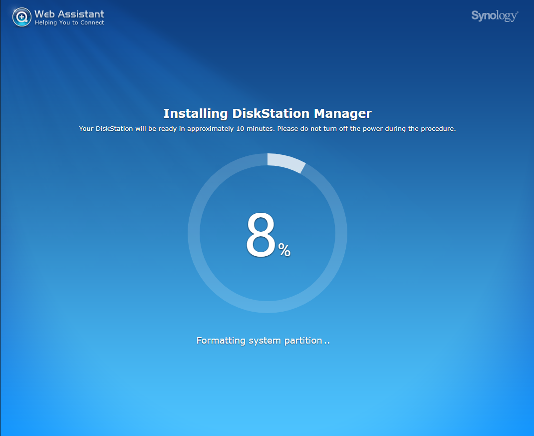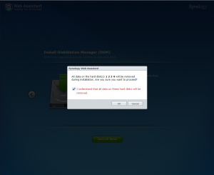 Pressing install (there’s also a manual install option to install a downloaded instance of DSM) automatically downloads the latest version of DSM and starts installing it after reminding you that any data on the hard disks will be deleted.