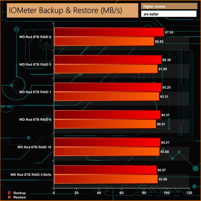 We set IOmeter up (as shown above) to test both backup and restore performance on a 100GB partition.