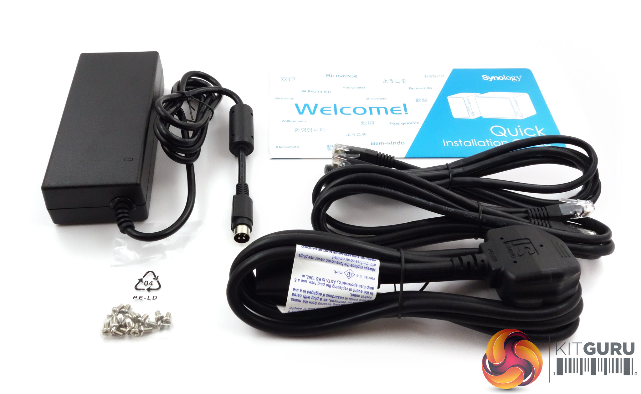 The box bundle contains everything you need to get started; PGB EA11011D-120 power adapter (rated at 100W), a pair of Ethernet cables, fixing screws for 2.5in drives and a quick install guide.