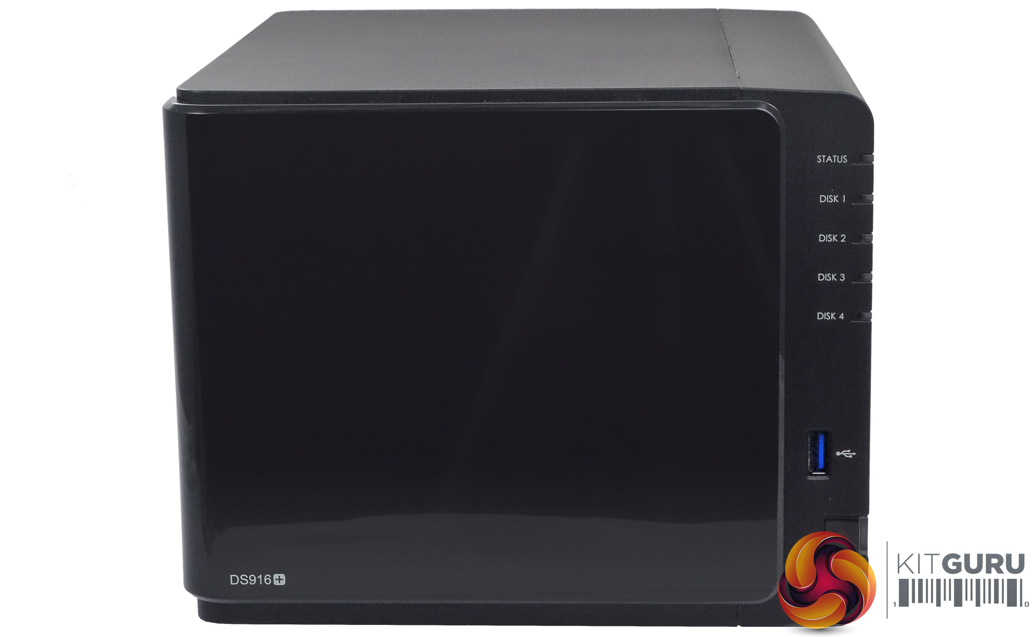 The Synology DiskStation DS916+ is a compact 4-bay tower design, with a matt black cover set off by a fingerprint attracting high gloss Piano Black front bezel – this just pulls off. A neat design touch is that the Synology branding on the cover sides is cut through, to aid in the cooling of the drives.