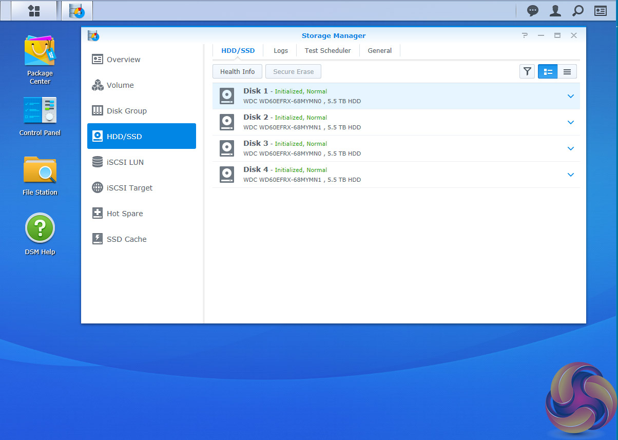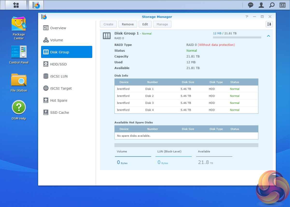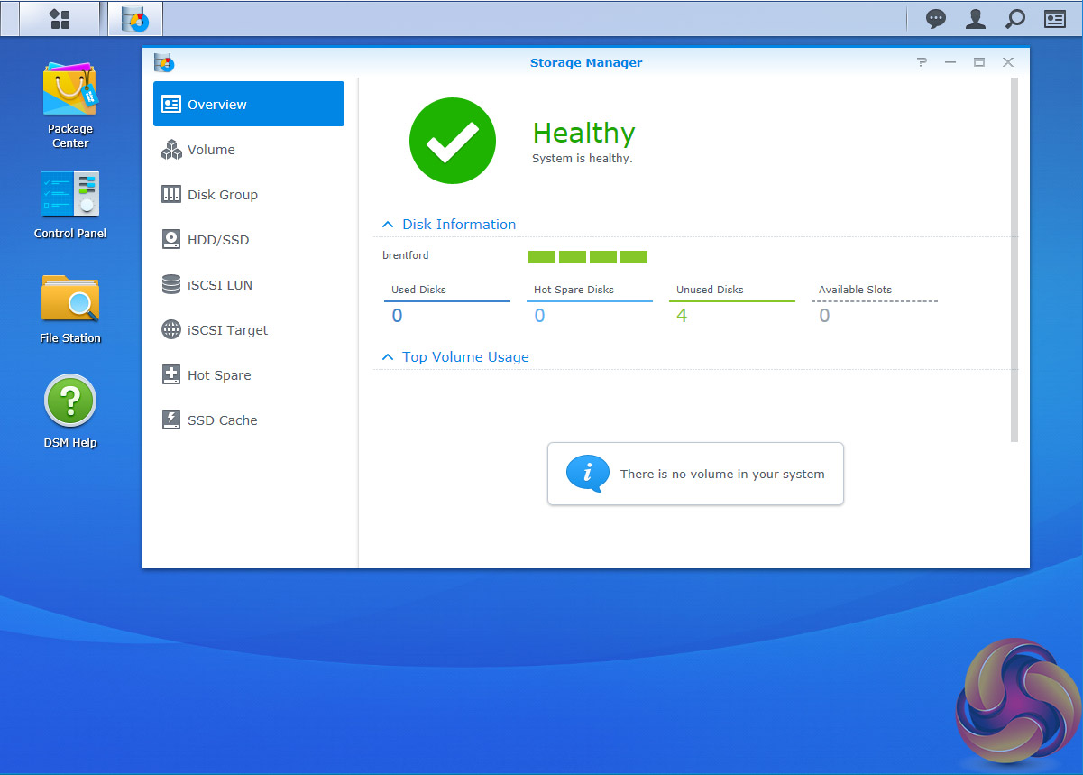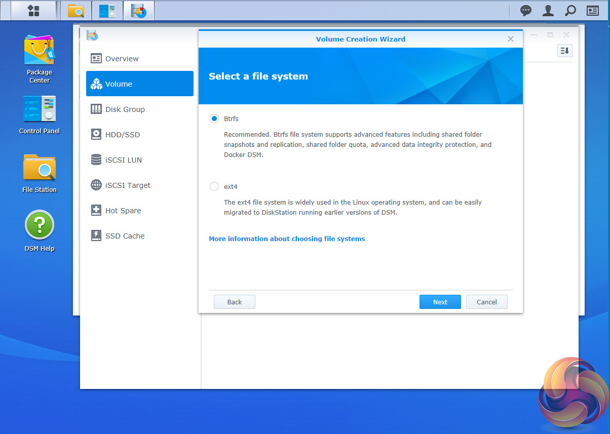 Storage Manager looks after RAID setups, volume creation (choose between Btrfs or ex4) and all other disk management duties.