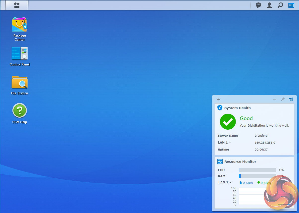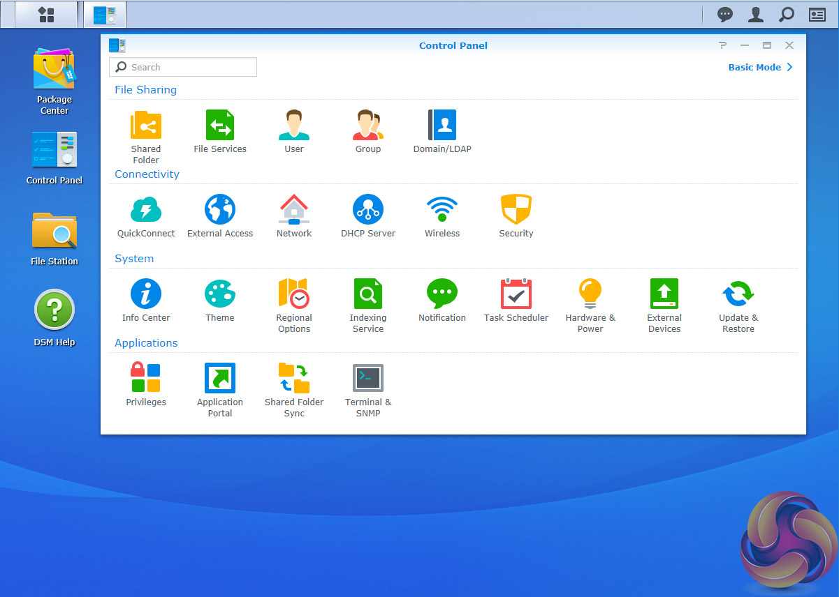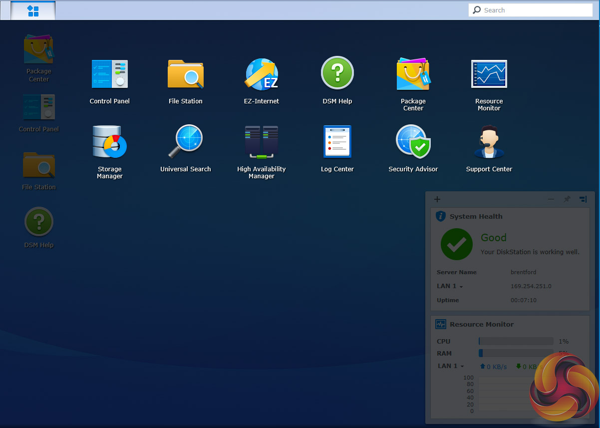 DSM has a graphically rich interface with all the major features of the OS clearly listed. The basic start page just lists four items; Package Center, Control Panel, File Station and DSM help.