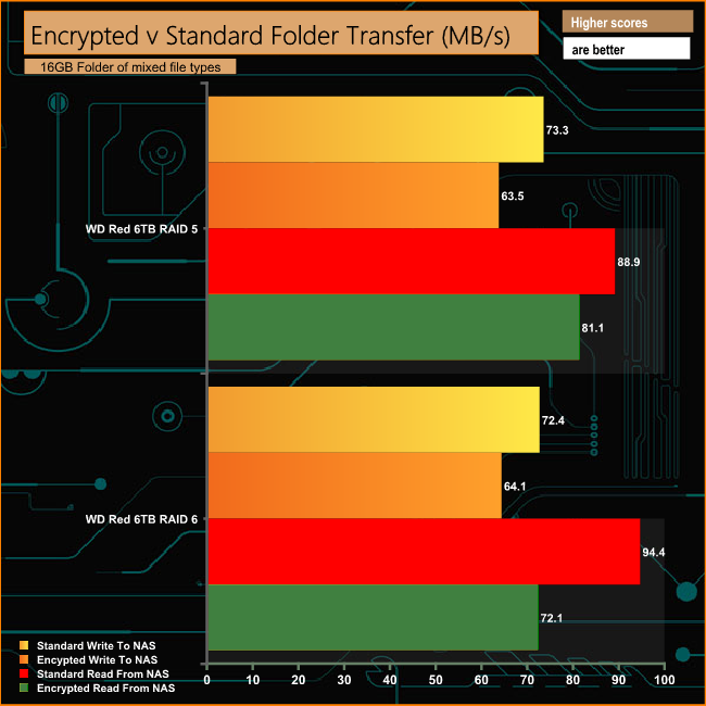 The AES-NI hardware encryption engine in the DS918+ does a very good job of negating the effects of dealing with data encrypted transfers. In a RAID 5 array there's only just under 10MB/s drop in performance when writing to the DS918+ and just 7.8MB/s are dropped when reading the data back.