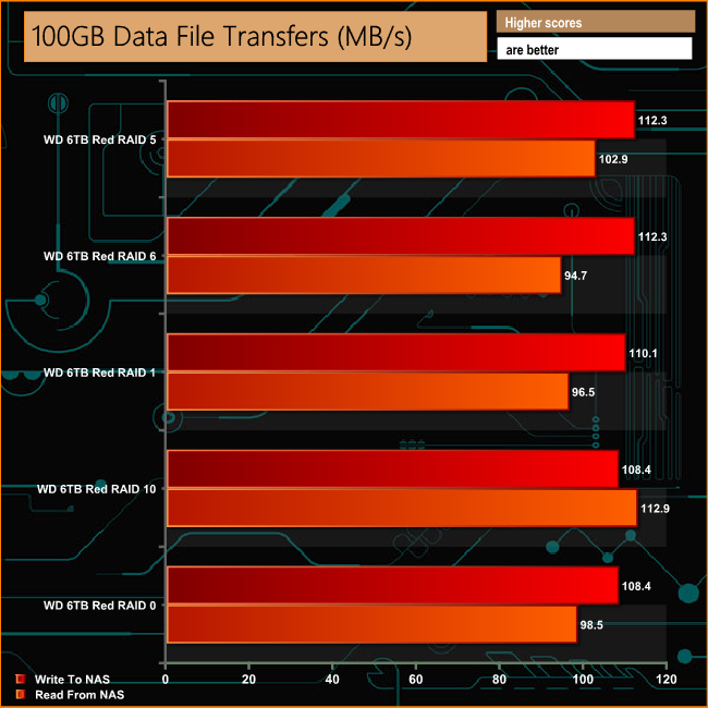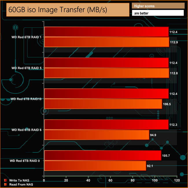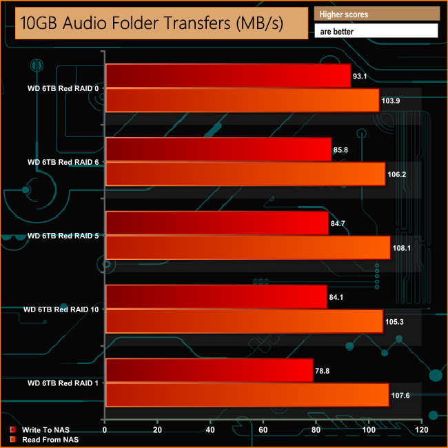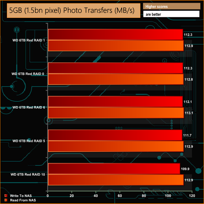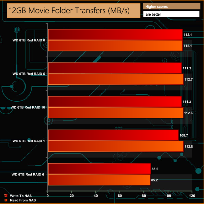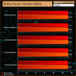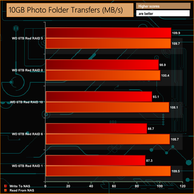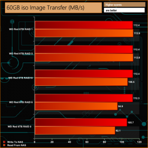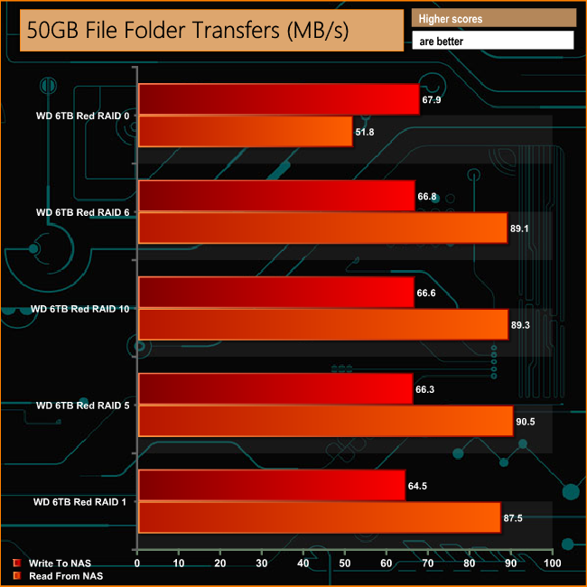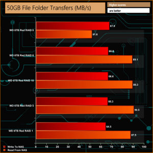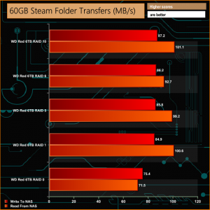 When it came to dealing with our real life file and folder tests, the DS918+ showed consistent performance across the arrays. Even the 50GB File and 60GB Steam folders tests seemed to prove little hindrance to the NAS, although having said that, the performance did trail off a little when reading back the data in the 50GB File folder transfer test in RAID 0.