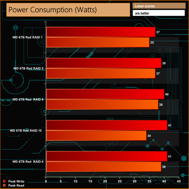 Synology quote a 28.8W power access figure for the DiskStation DS918+ using four 1TB WD Red (WD10EFRX) drives. For testing purposes we used four WD Red 6TB drives which are a bit more power hungry at 5.3W (active read/write) than the 3.3W active figure for the 1TB version of the Red.