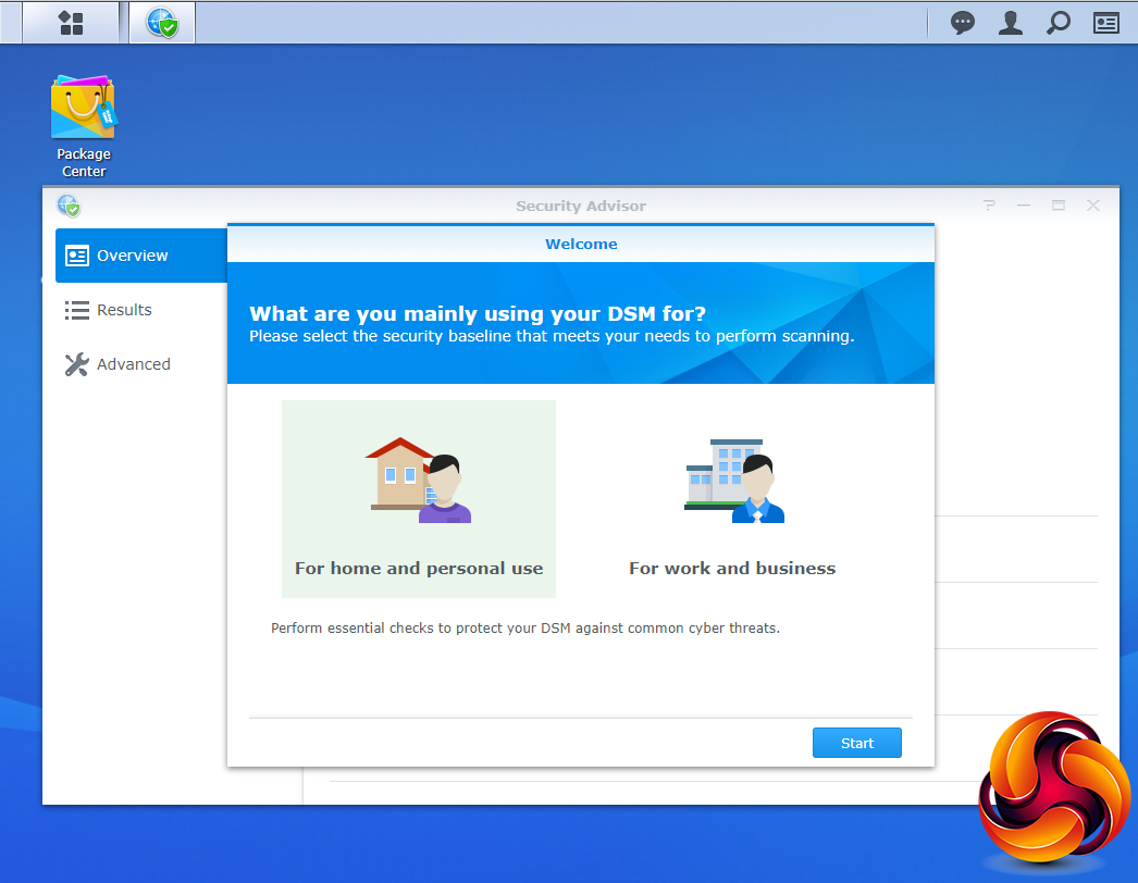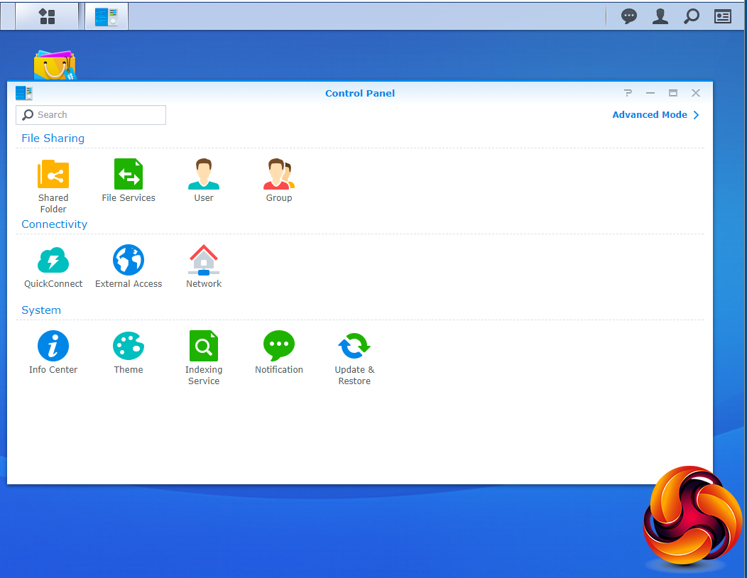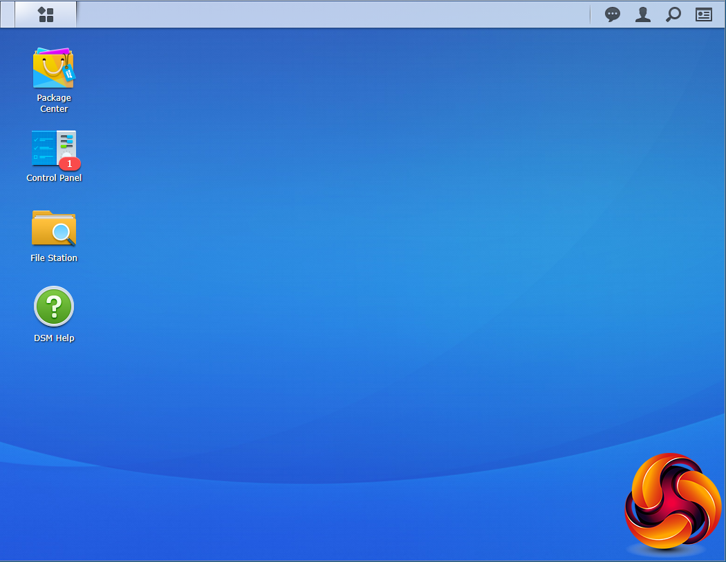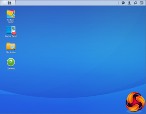 The basic start page just lists four items; Package Center, Control Panel, File Station and DSM help. Clicking on the left-hand top tab opens a small window with more advanced menu choices than the basic one.