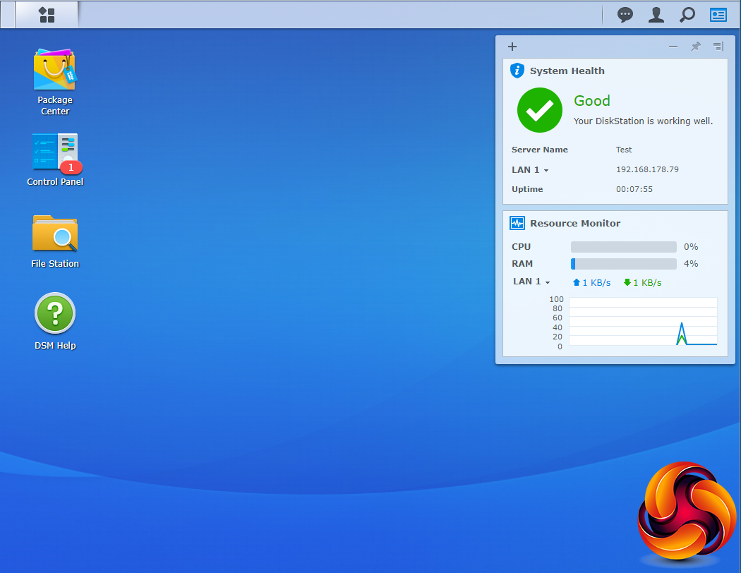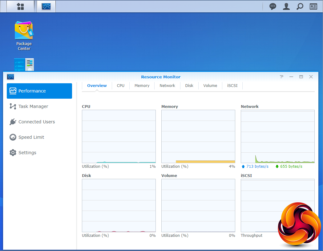 The Resource Monitor is an easy to use tool to keep an eye on the DiskStation’s resources. With it you can monitor CPU usage, memory usage, disk utilization and network flow in real time or historically.
