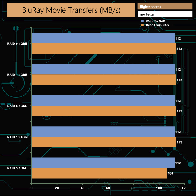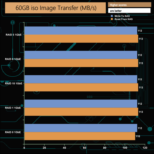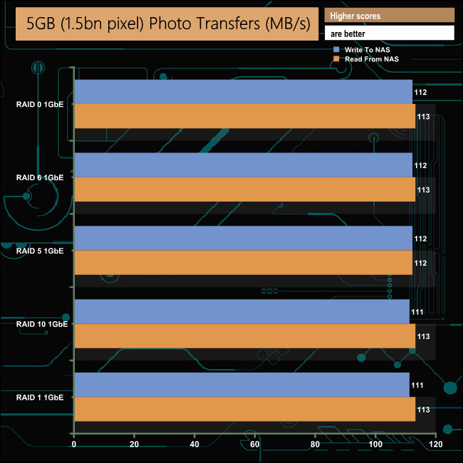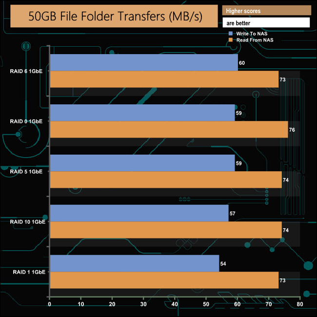 To test real-life file/folder performance we use a number of different file/folder combinations to test the read and write performance of the NAS device. Using the FastCopy utility to get an MB/s and time taken for each transfer, the data is written from and read back to a 240GB SSD.